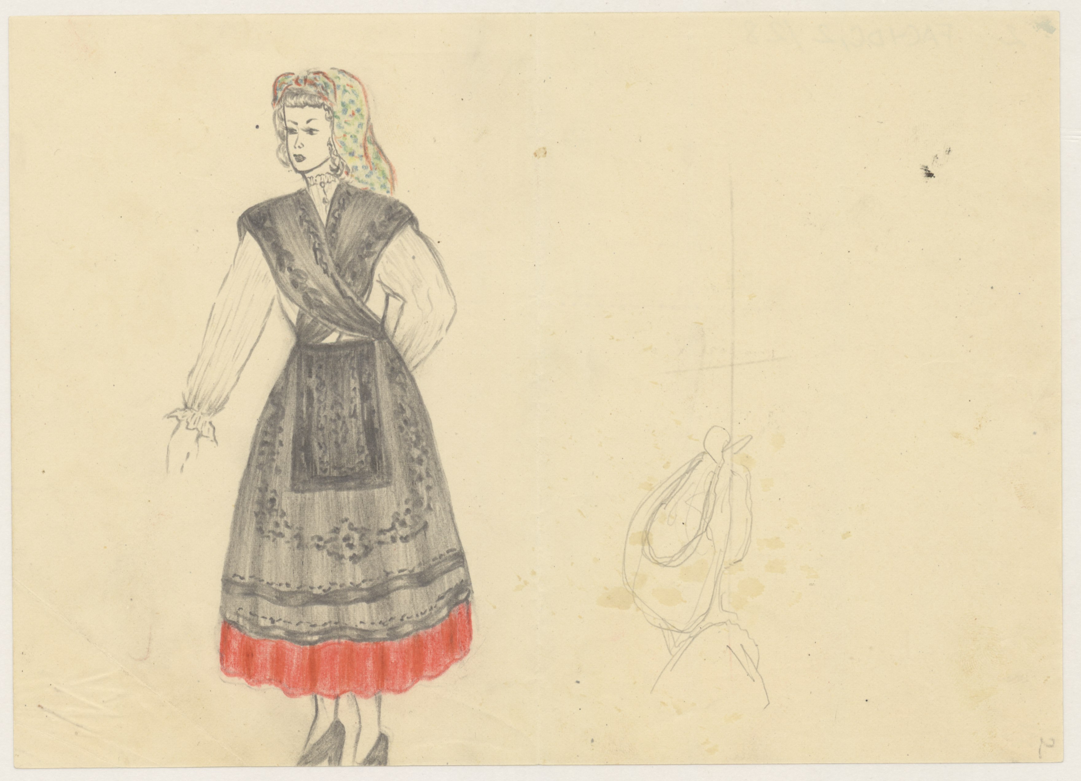 Carta redactada en papel tamaño cuartilla, con logotipo y membrete de Falange Española Tradicionalista y de las JONS, Delegación de la Sección Femenina en Orense. Lleva sello de Registro de salida número 1127, de 26 de mayo de 1947. Sobre las firmas y rúbricas de las remitentes, lleva sello de esa Delegación. Dibujo en color realizado sobre papel tamaño cuartilla representando la figura de una mujer vestida con el traje típico, vista de frente.