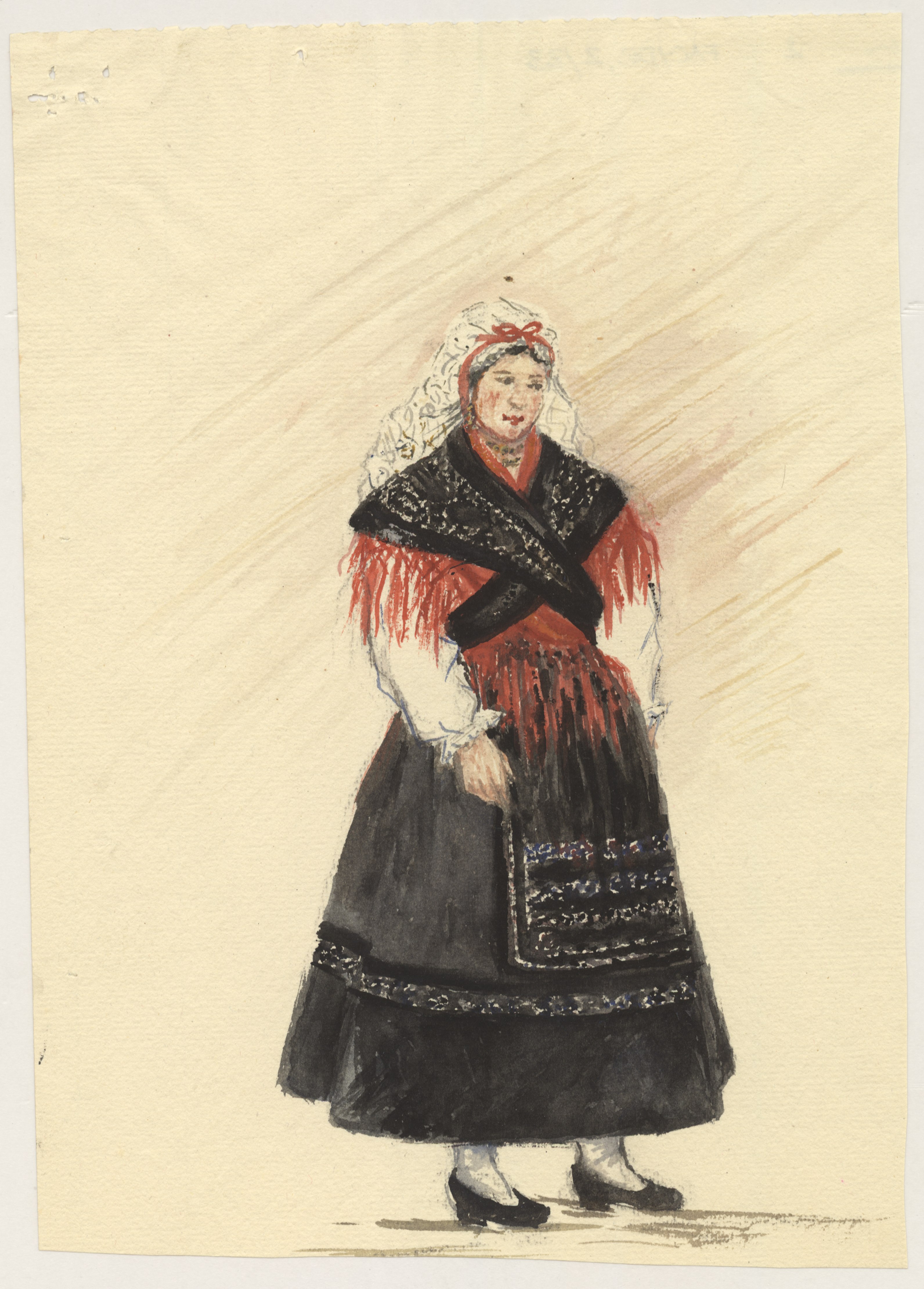 Informe redactado en papel tamaño folio, sin firma, con sello ilegible, probablemente de esa Delegación. Dibujo a color realizado en papel grueso tamaño folio, representando la figura de una mujer vestida con el traje típico.