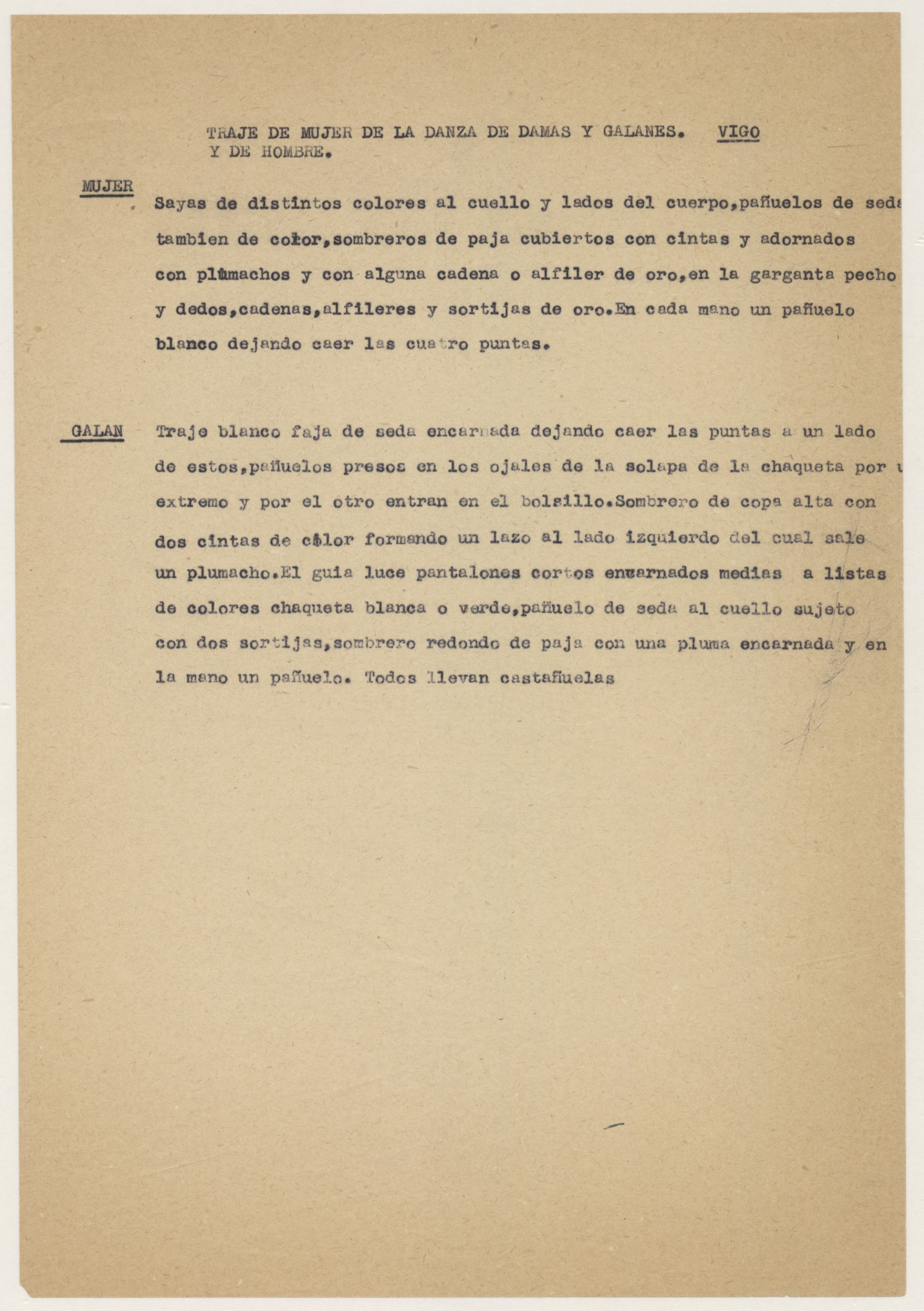 Informe sobre los trajes típicos de mujer y de hombre utilizados para la Danza de Damas y Galanes.