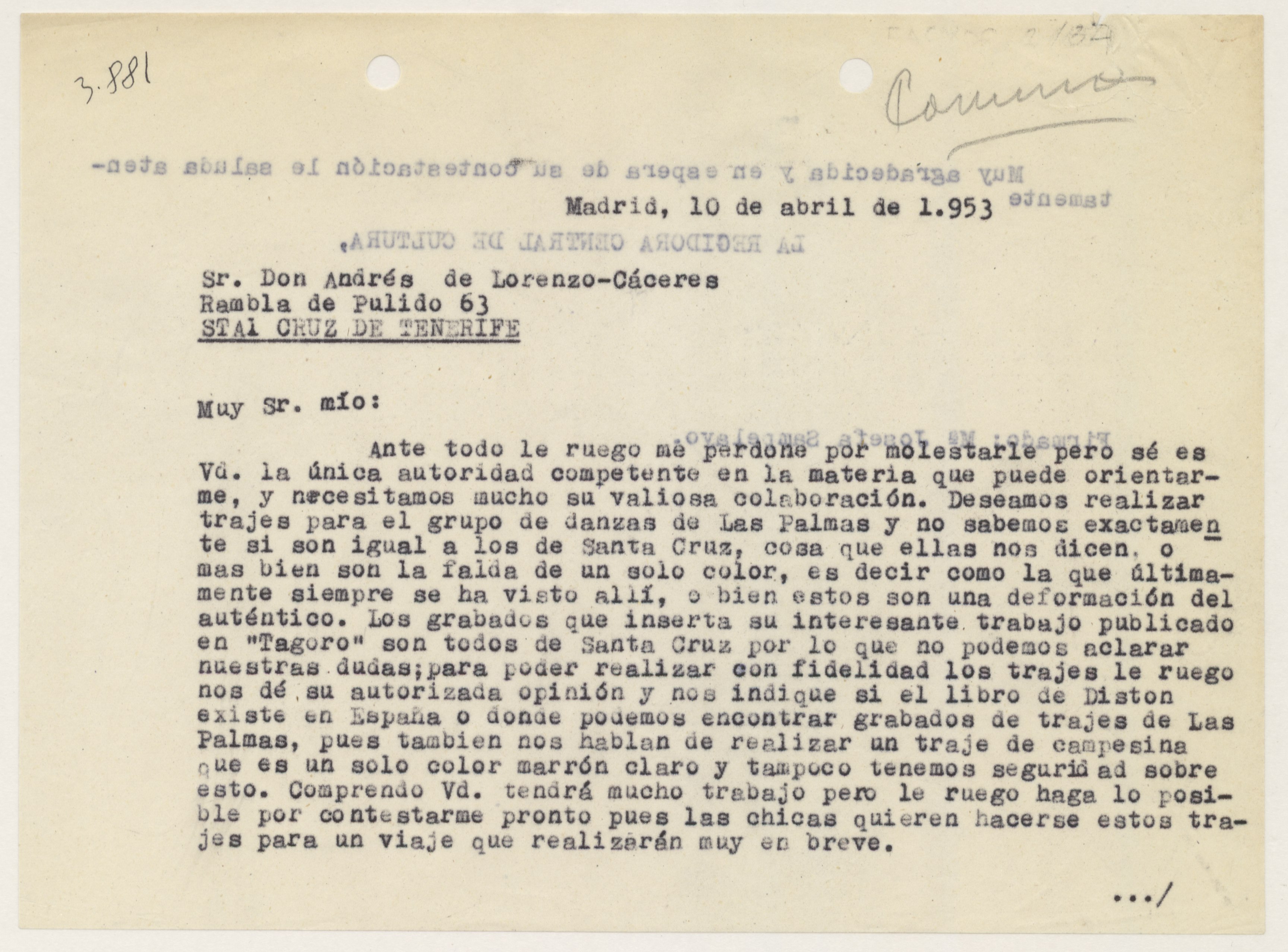 Copia de la carta de María Josefa Sampelayo, regidora central de Cultura de la Sección Femenina, a Andrés de Lorenzo-Cáceres sobre diversas consultas acerca del diseño de los trajes típicos regionales de Canarias.