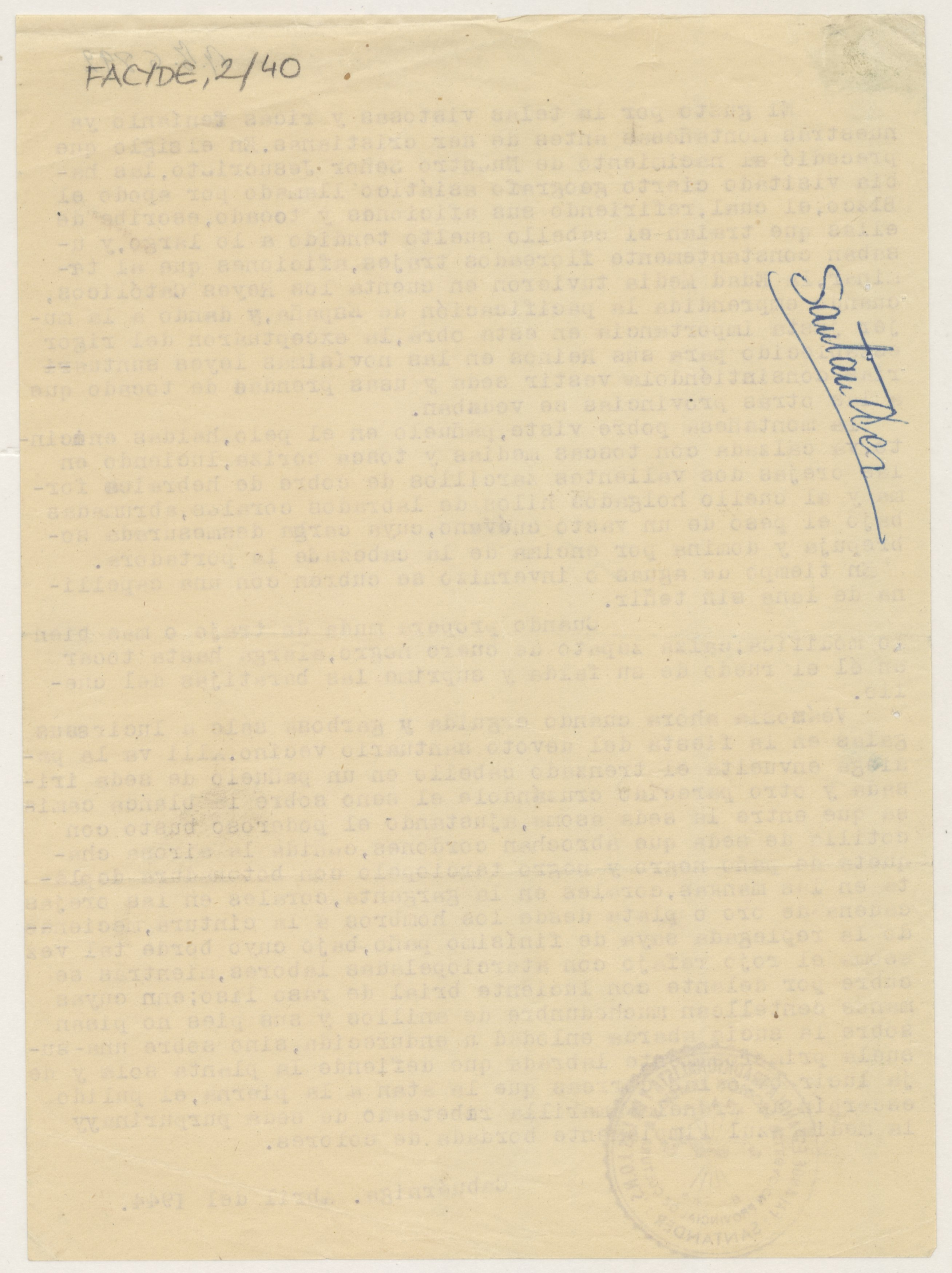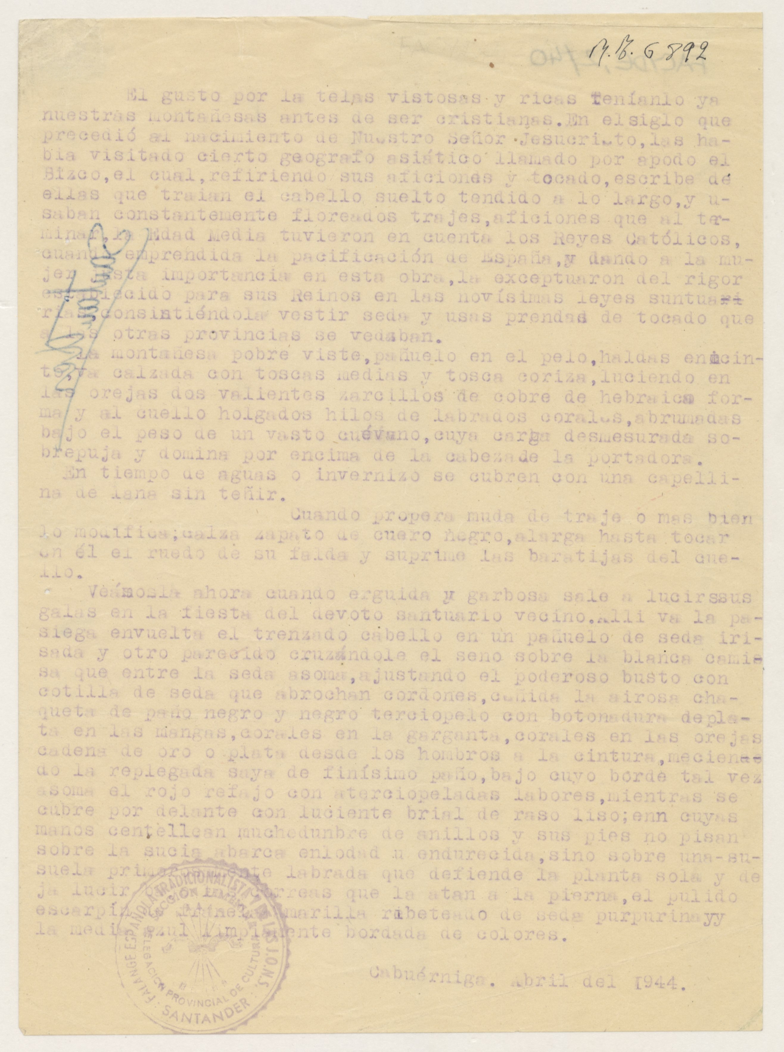 Informe redactado en papel tamaño cuartilla, sin firma, con sello de la Delegación Provincial de Cultura de la Sección Femenina en Santander.