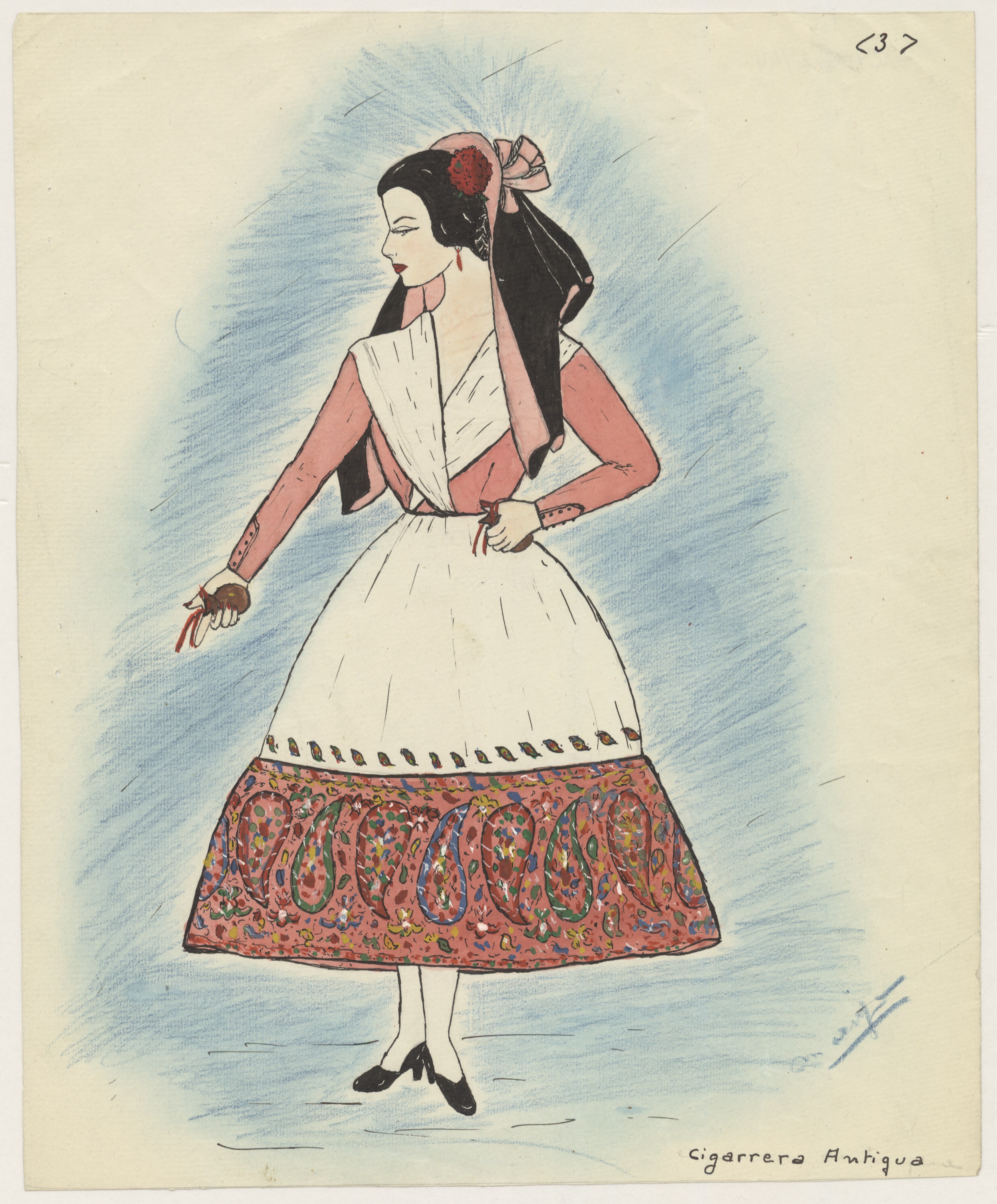 Dibujo a color de mujer vestida con traje típico de Sevilla conocido como traje de cigarrera antigua.