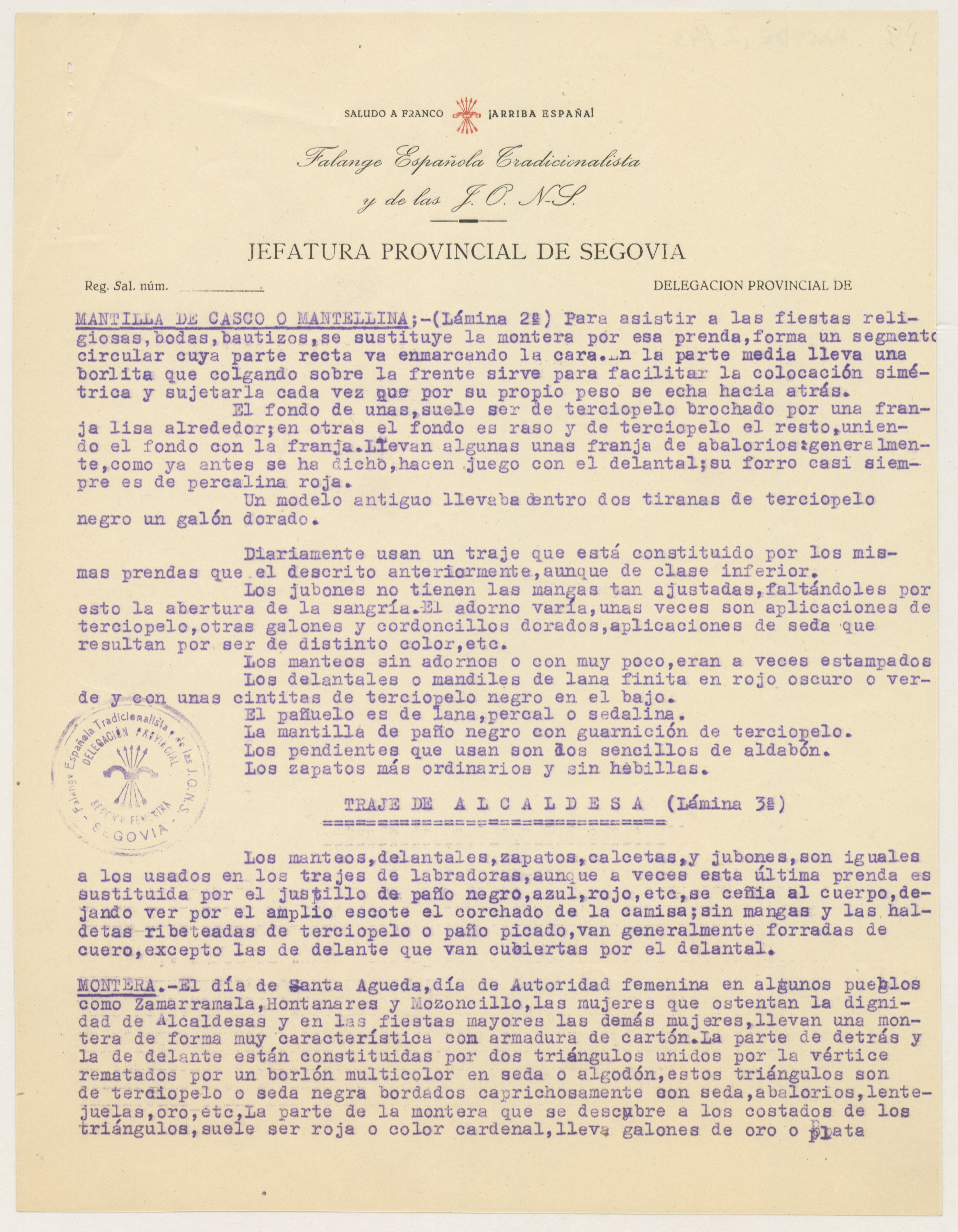 Informe redactado en papel tamaño folio, con marca de agua Cegama Bond y logotipo en color, membrete y saludas de Falange Española Tradicionalista y de las JONS, Jefatura Provincial de Segovia, Departamento de Cultura. El texto describe los trajes "de labradora" y "de alcaldesa" basándose en láminas ilustradas no incluidas.