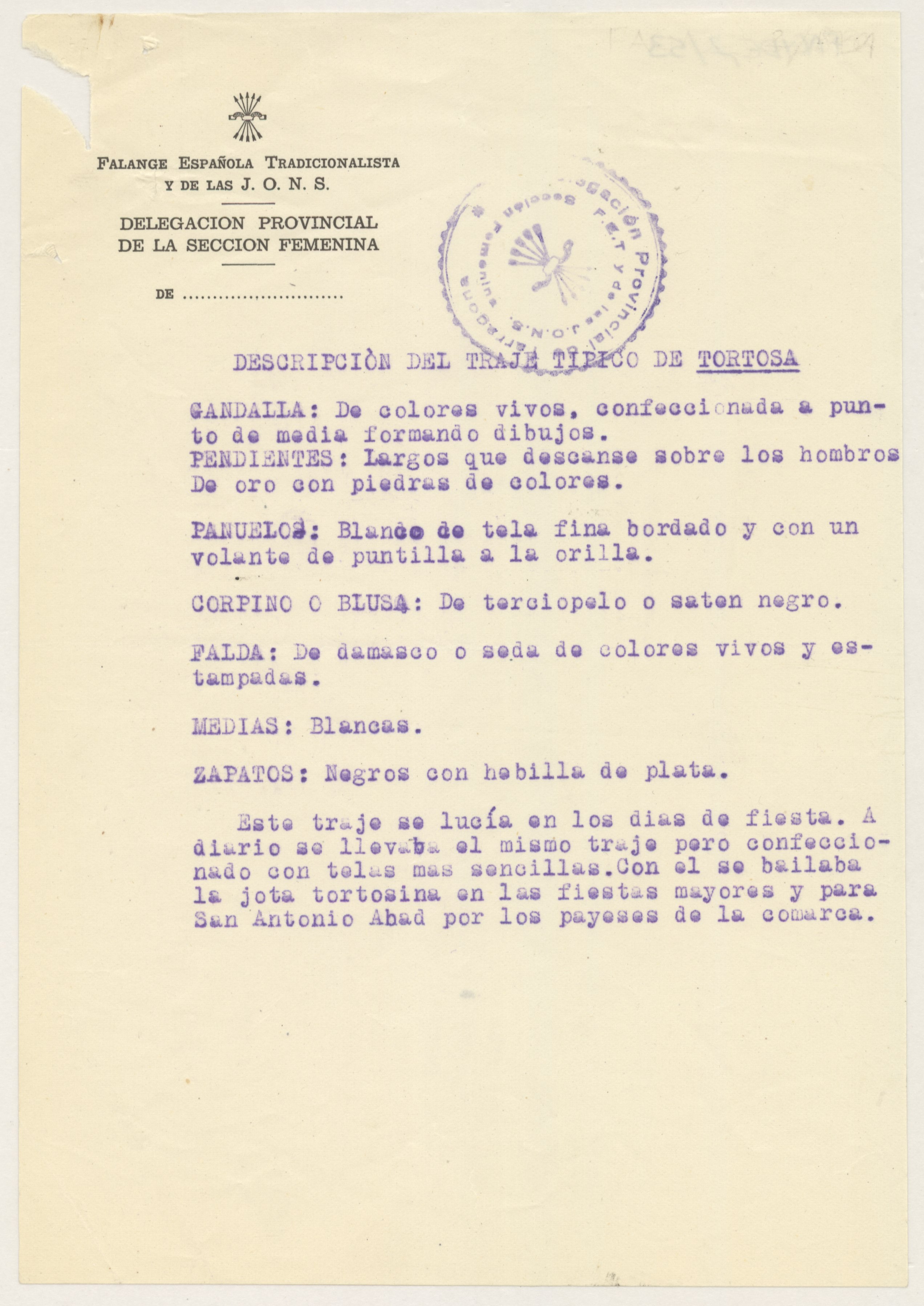 Informe con la descripción del traje típico de Tortosa.