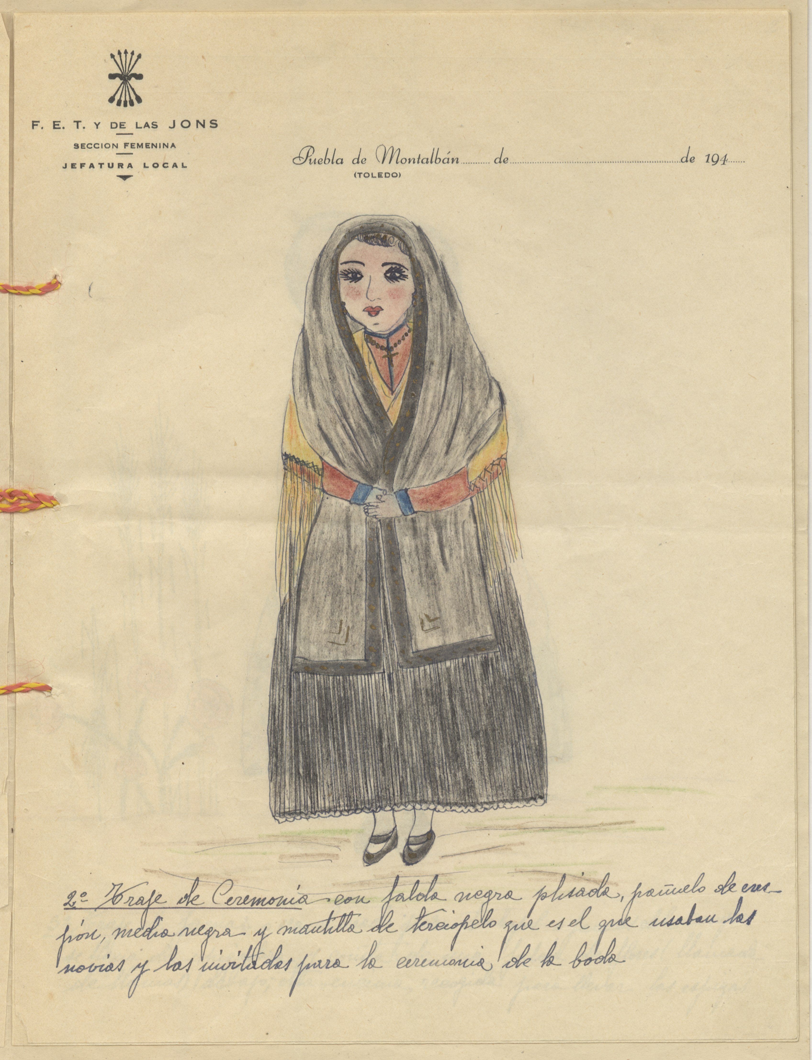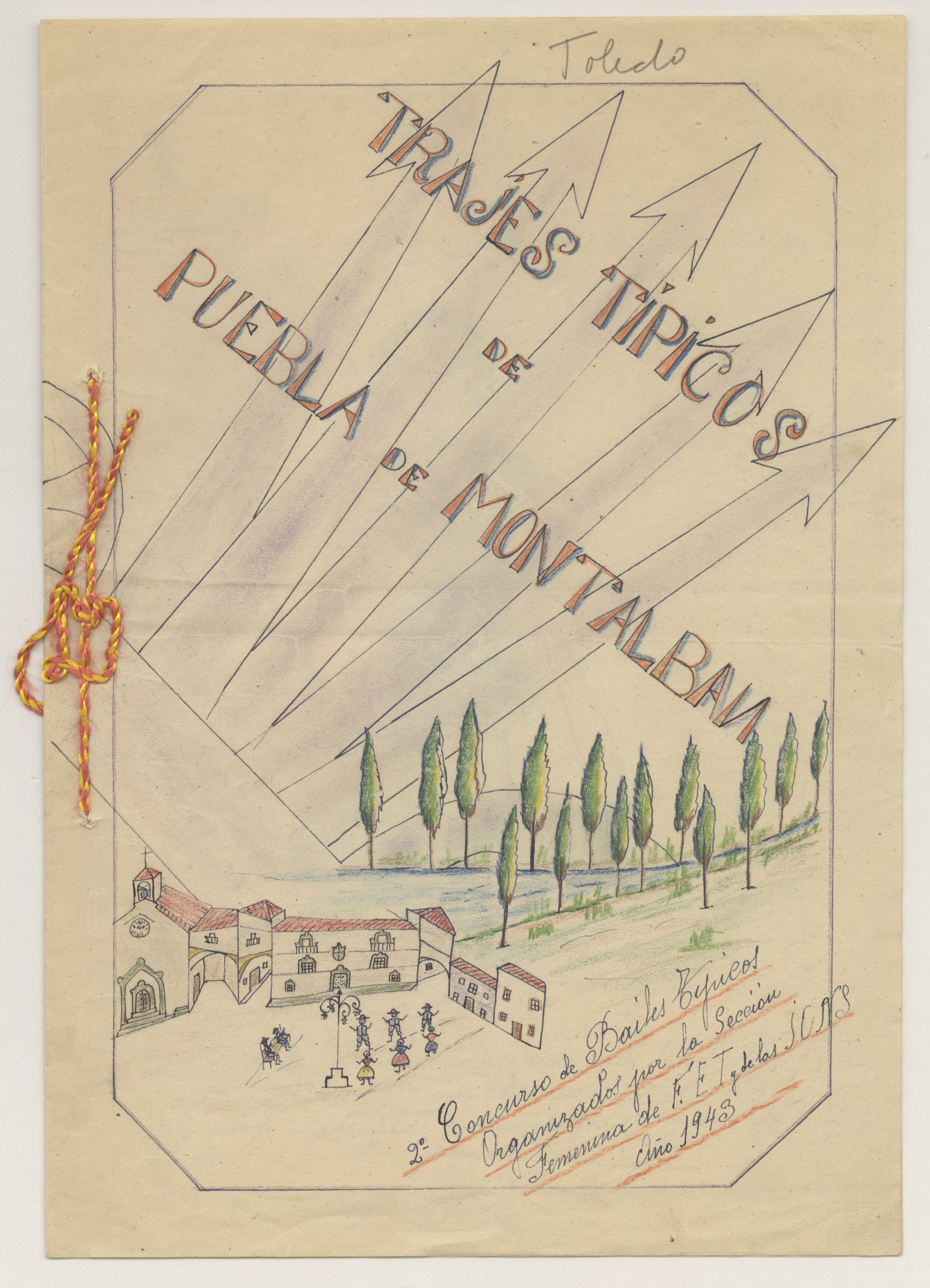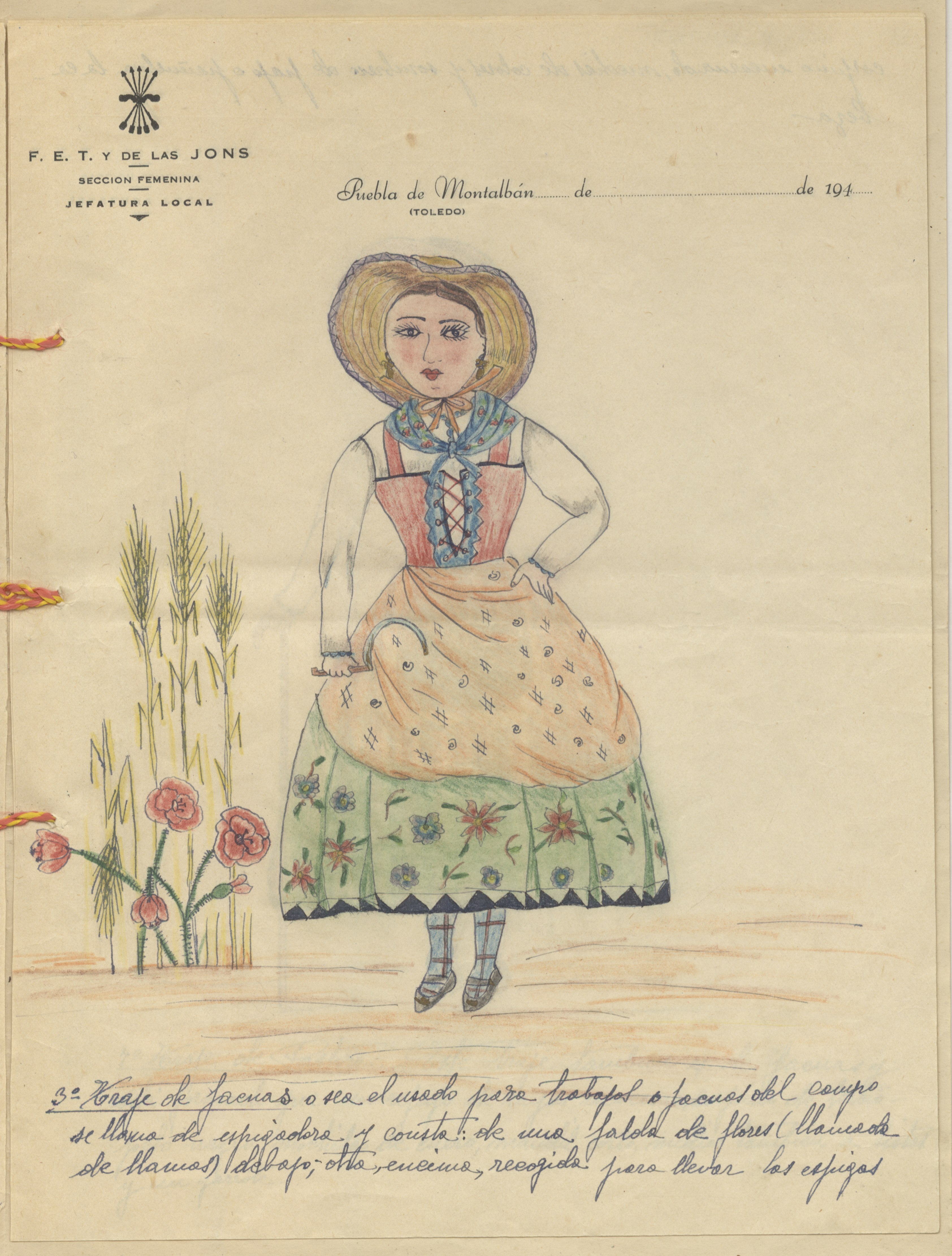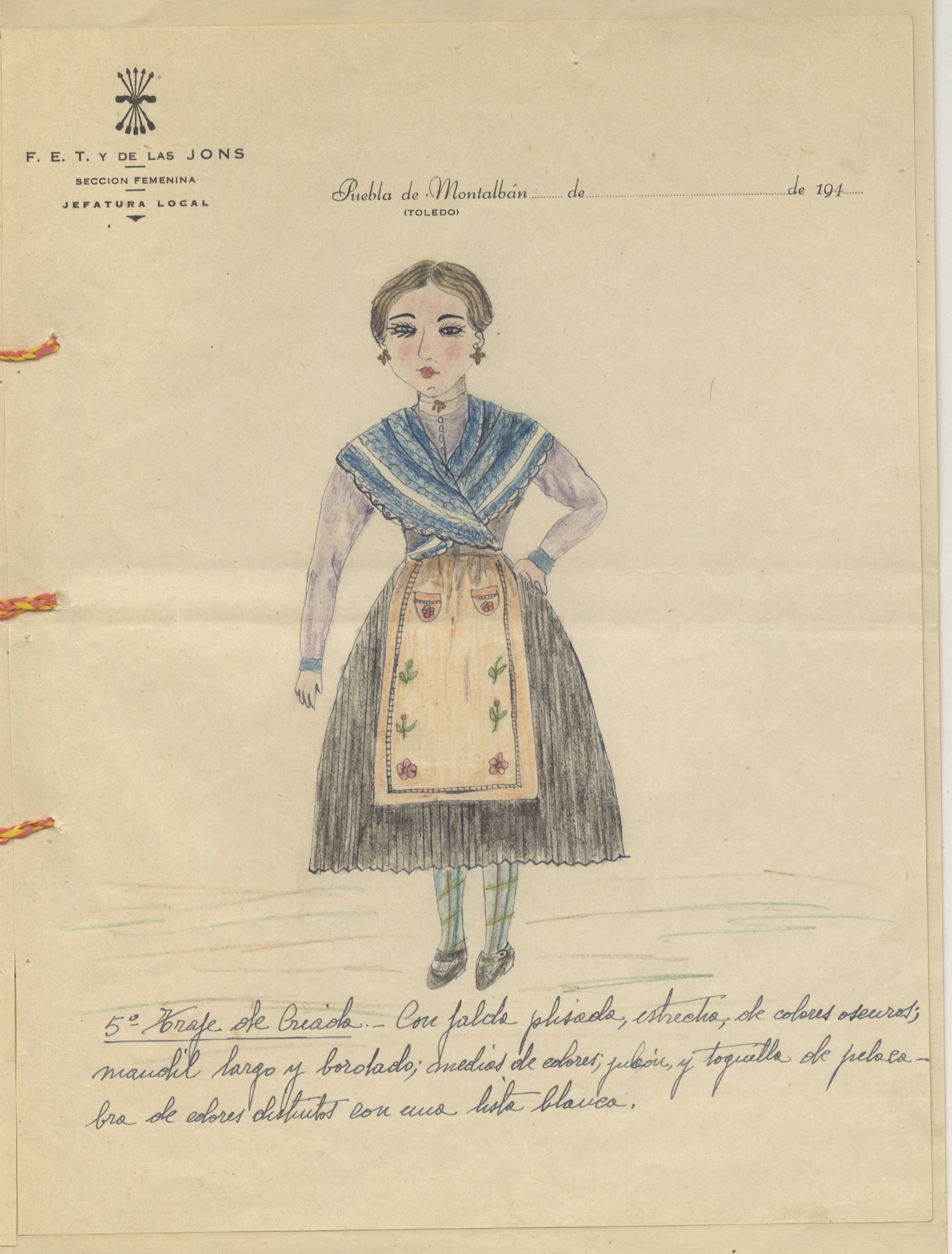 Cuadernillo formado por cinco hojas tamaño folio con los informes manuscritos que describen los cinco dibujos de los trajes típicos de la localidad. Las hojas llevan membrete de la Jefatura Local de la Sección Femenina en ese municipio. Los dibujos, a color, representan cinco trajes femeninos, vistos de frente. Hace de portada un bifolio ilustrado con una imagen del lugar, cerrado con cordón. Documento presentado para el 2º Concurso de Bailes Típicos Organizados por la Sección Femenina en 1943, según anotación al margen.