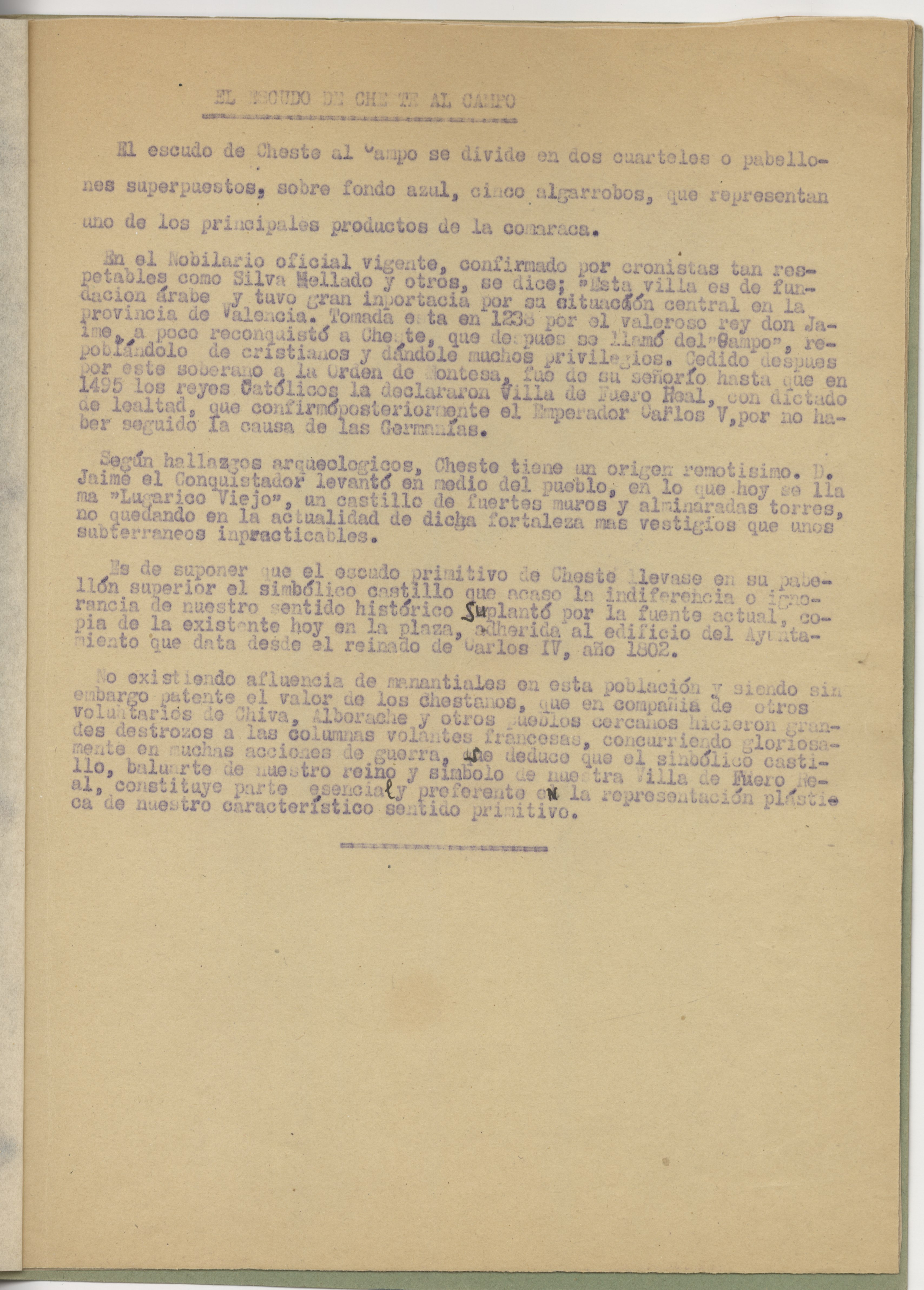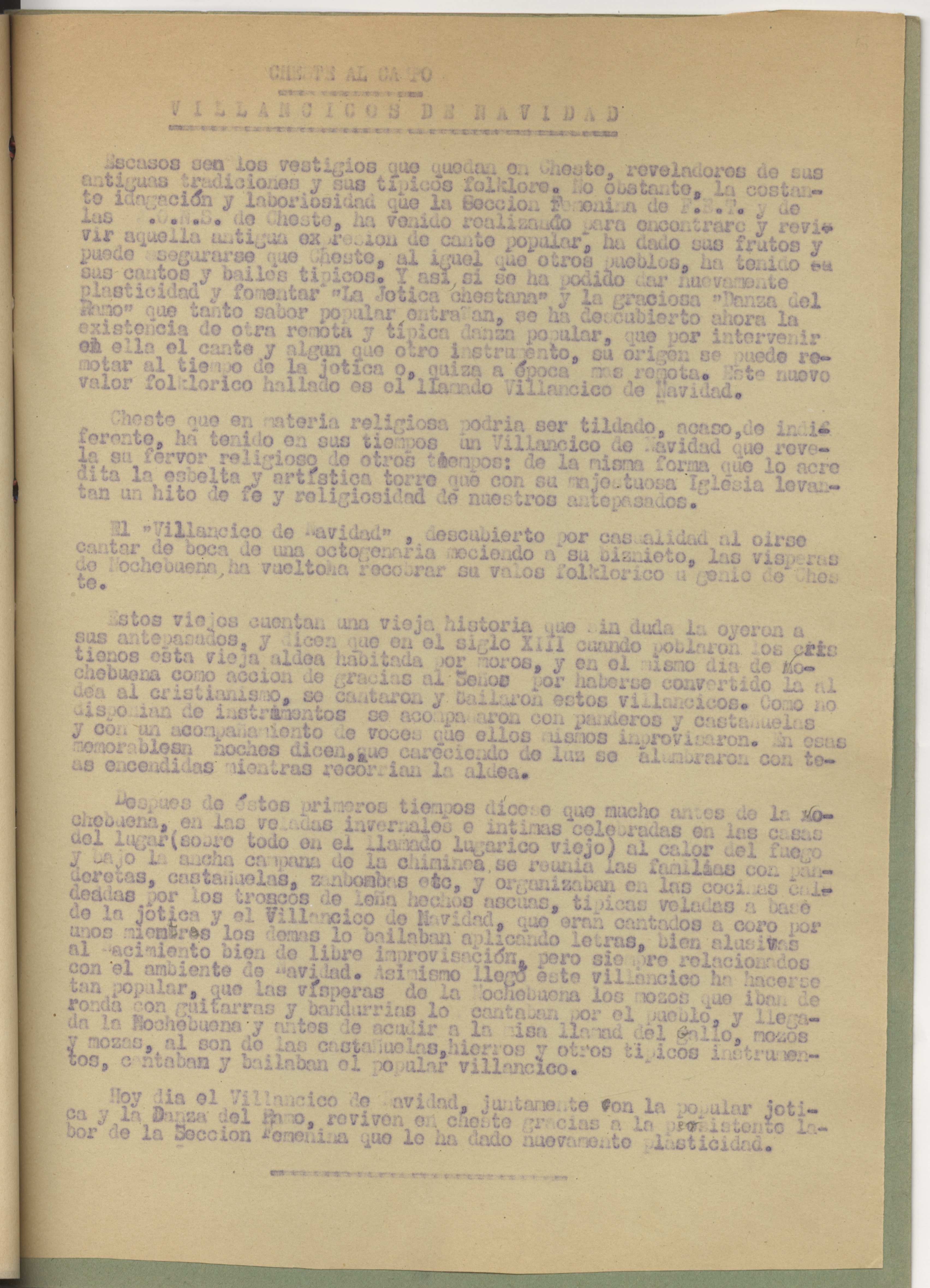 Cuadernillo formado por tres hojas de texto y dos con dibujos, tapas de cartulina ilustrada con el escudo local, a modo de portada, y cerrado con cordón. Los informes están redactados en papel tamaño folio, sin firma ni sellos, y el texto trata del escudo, el traje típico y los villancicos populares en la localidad. Los dibujos, a color, están realizados sobre papel tamaño folio y representan el traje típico femenino visto de frente y de espaldas.