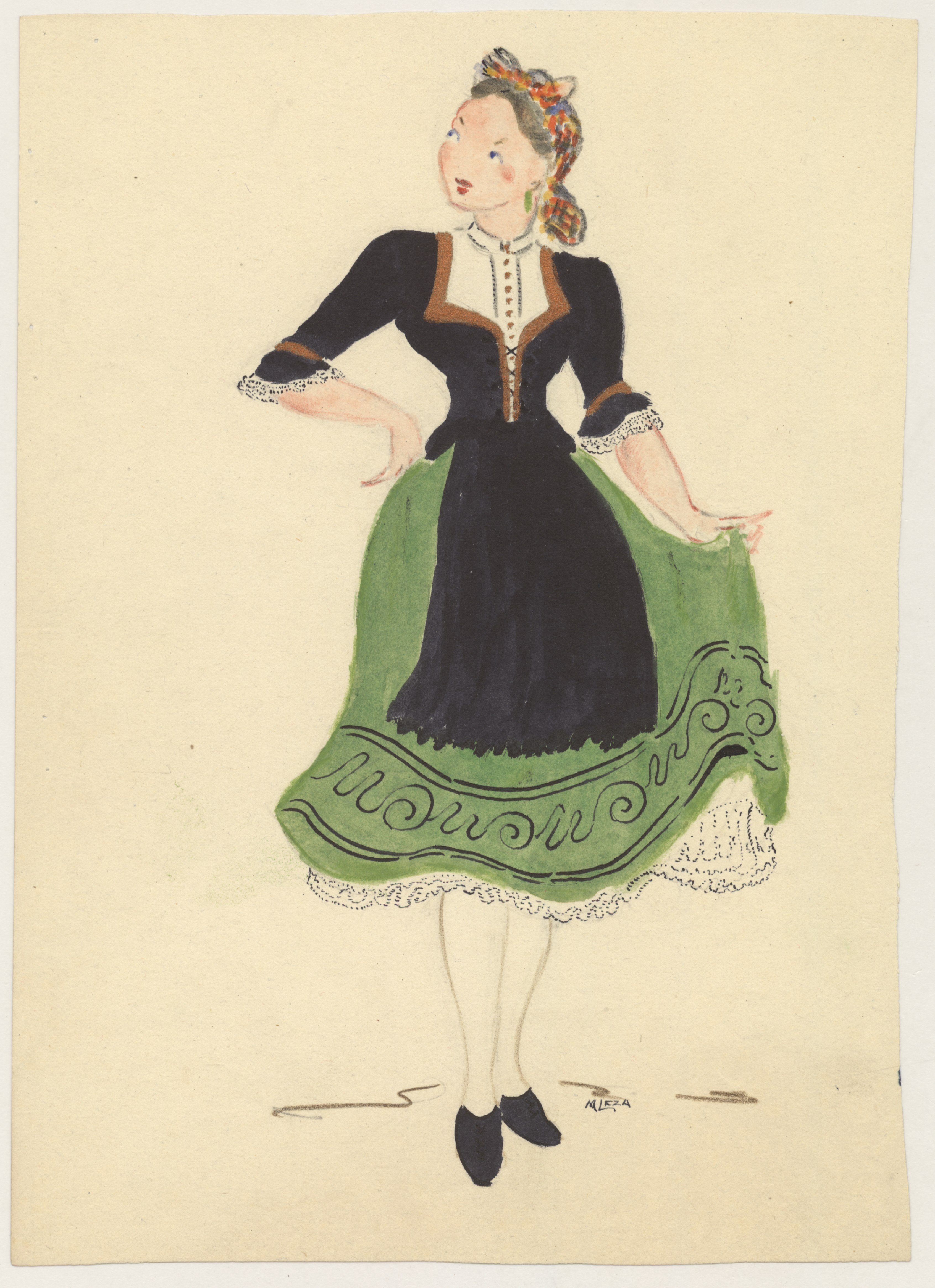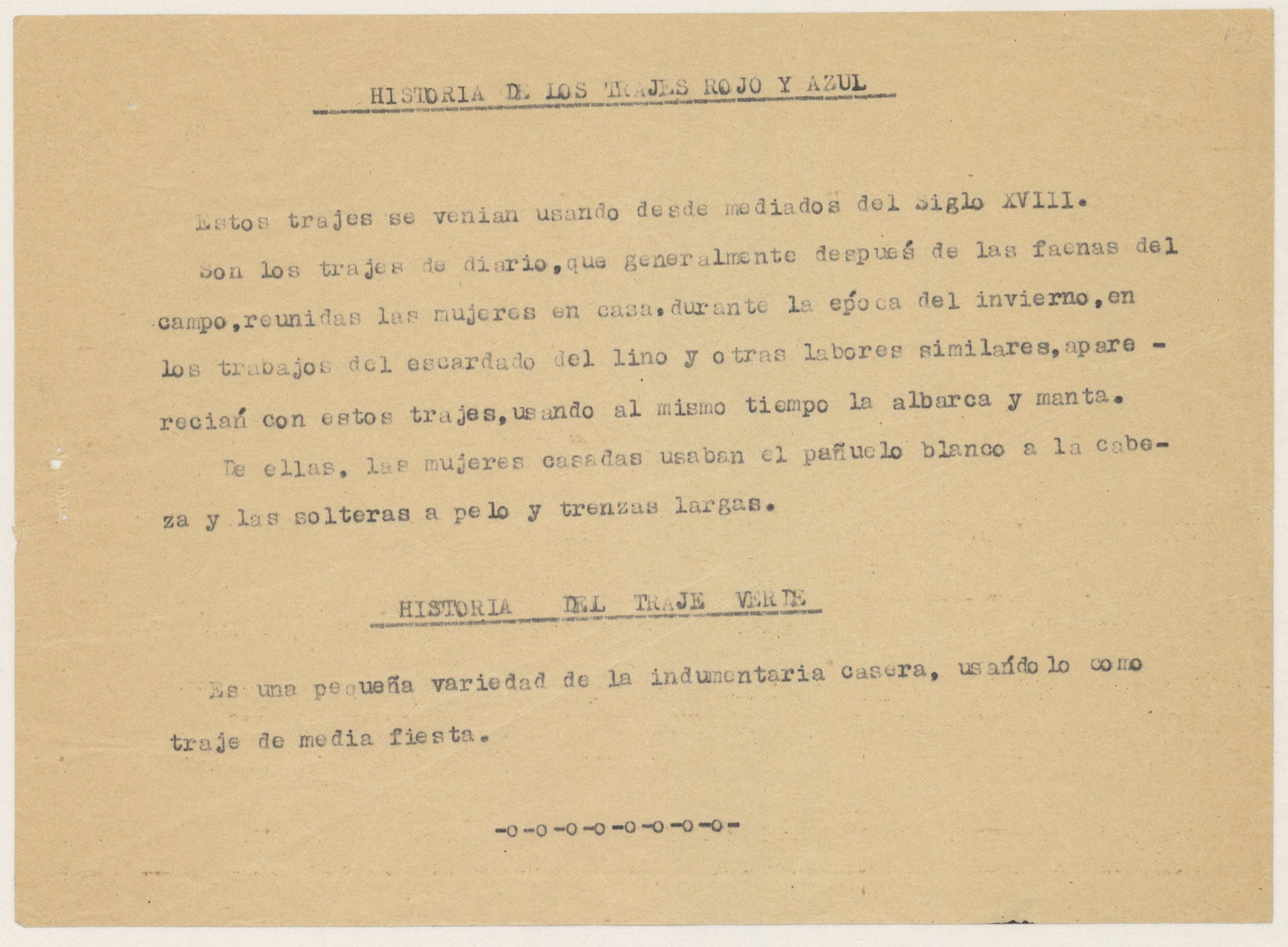 Informe redactado en papel tamaño cuartilla, sin firma ni sellos. Se describe la historia de los trajes rojo, azul y verde. Dibujos a color realizados sobre papel grueso tamaño folio, representando figuras de mujer vestidas con trajes típicos, firmados.