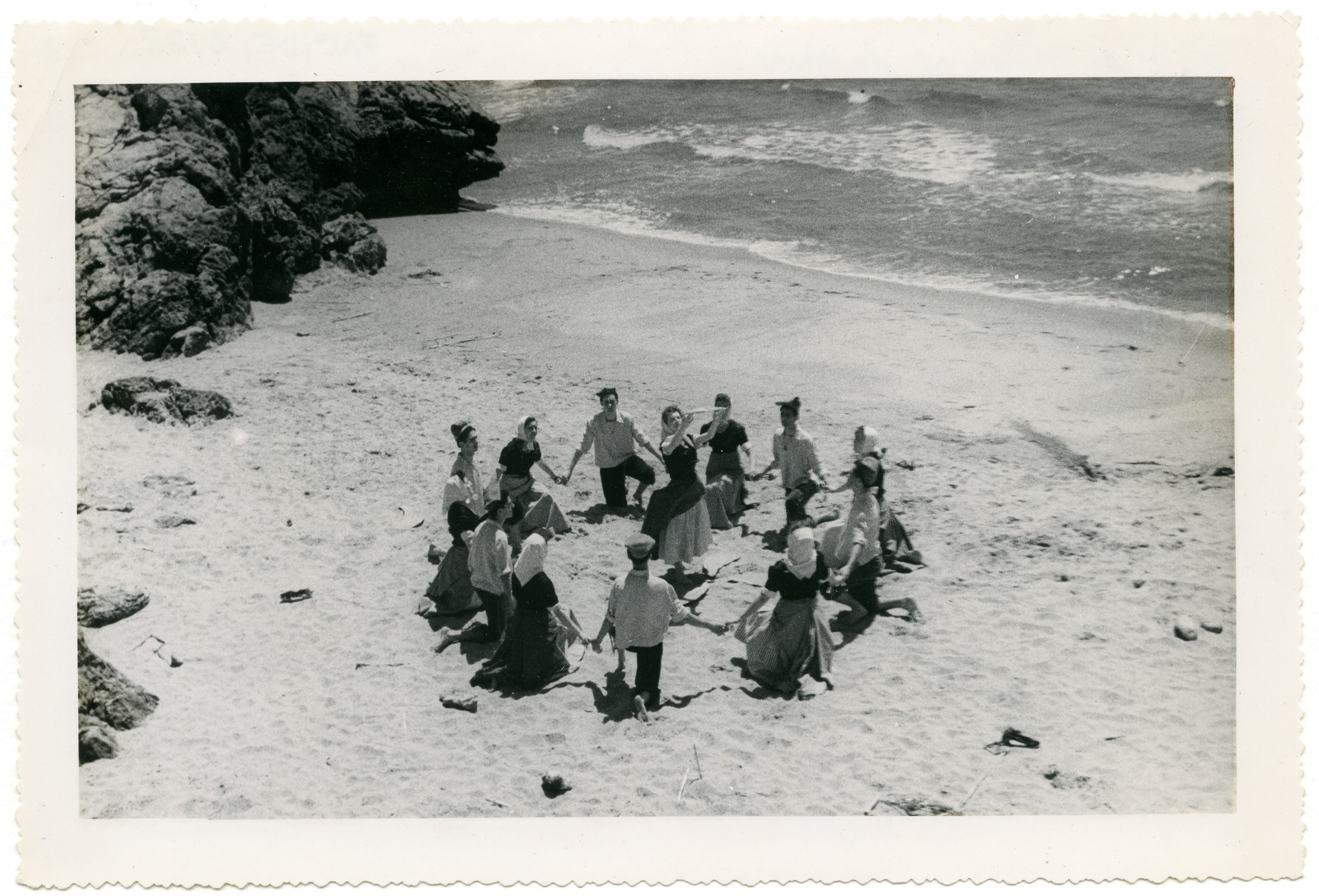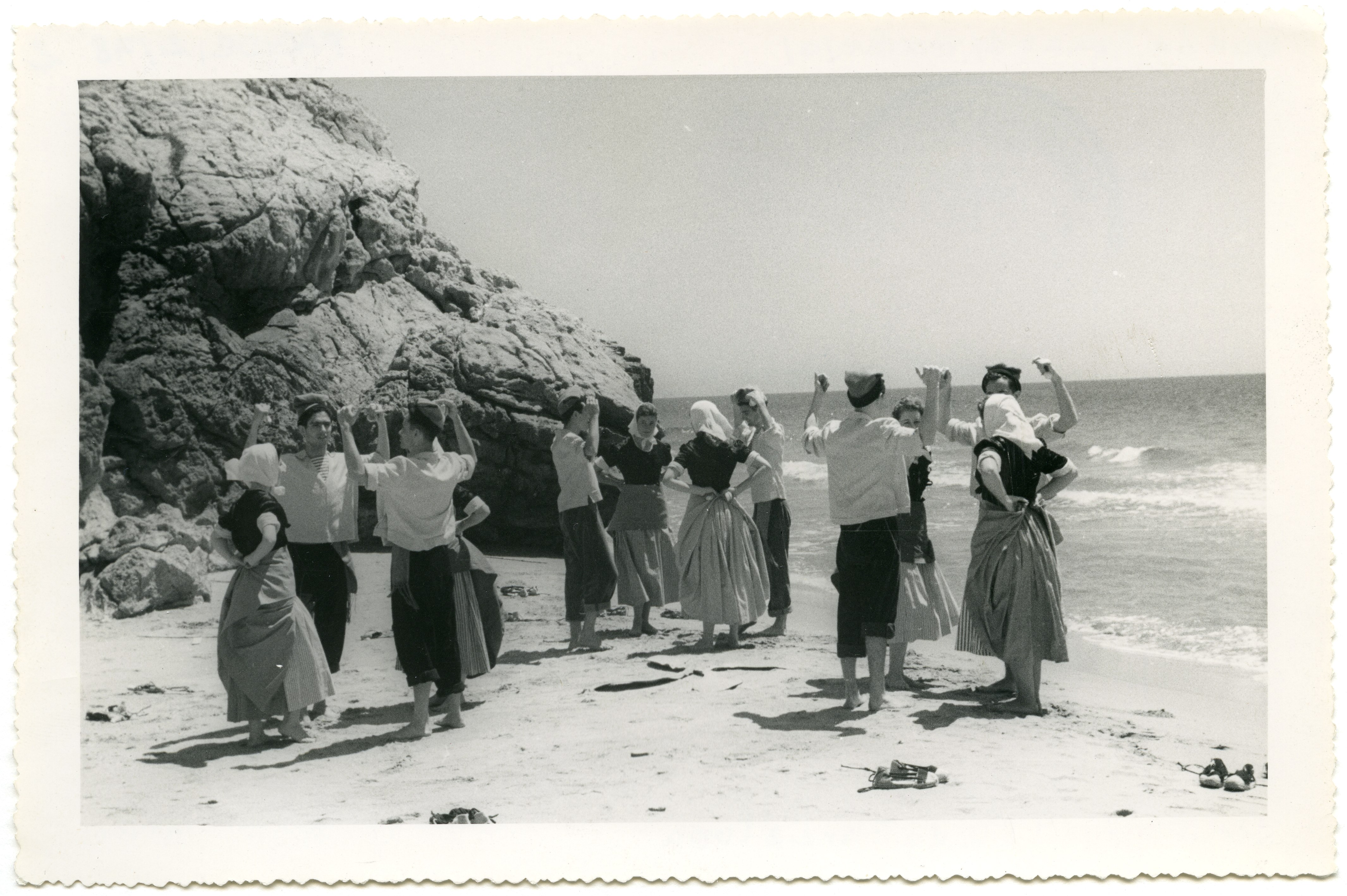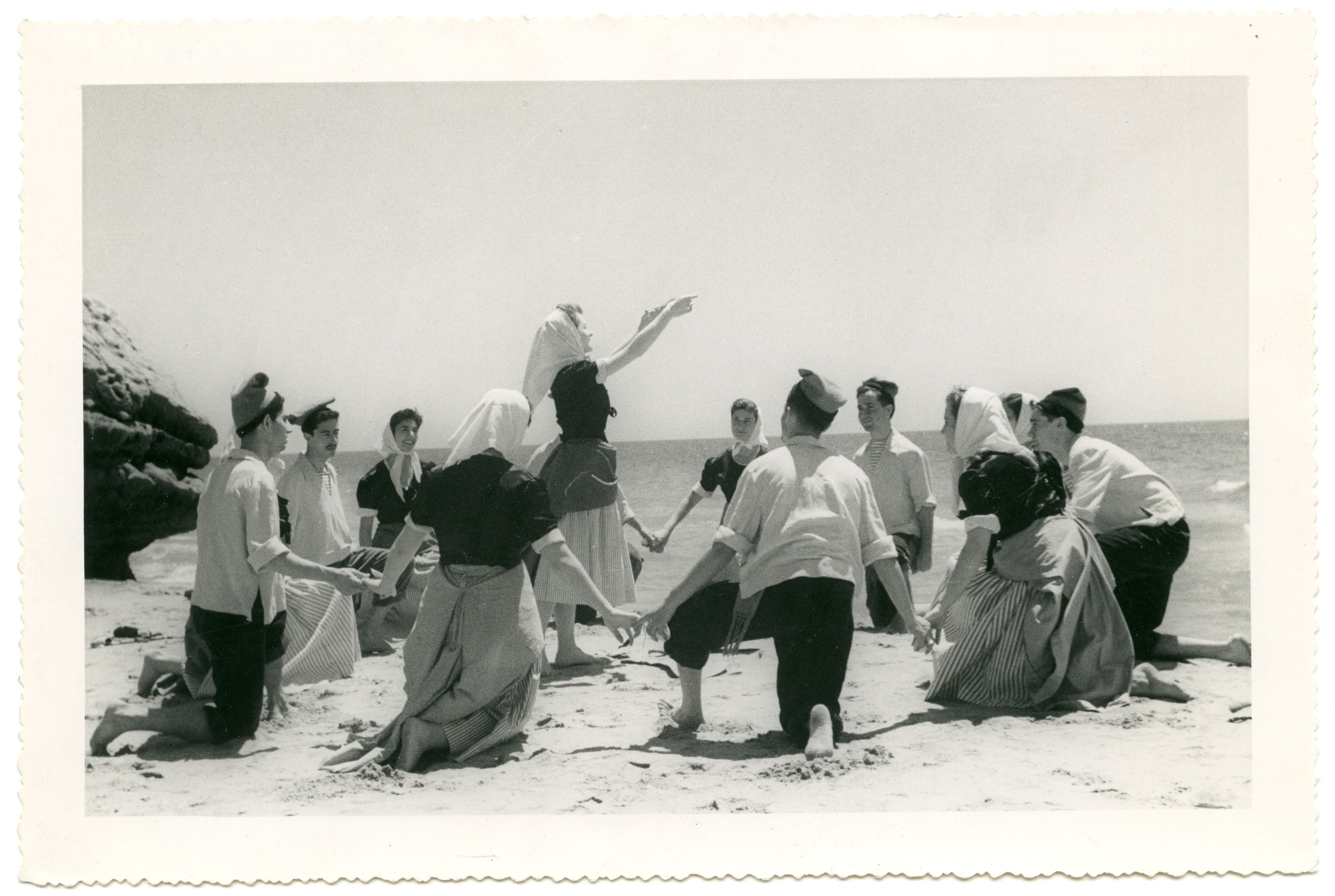 Fotografías del grupo representando el Ball de Nyacres de Roses, según anotaciones en el reverso de las imágenes, vestidos con el traje típico regional. Cada fotografía lleva el sello de la Delegación Provincial de la Sección Femenina en Barcelona.