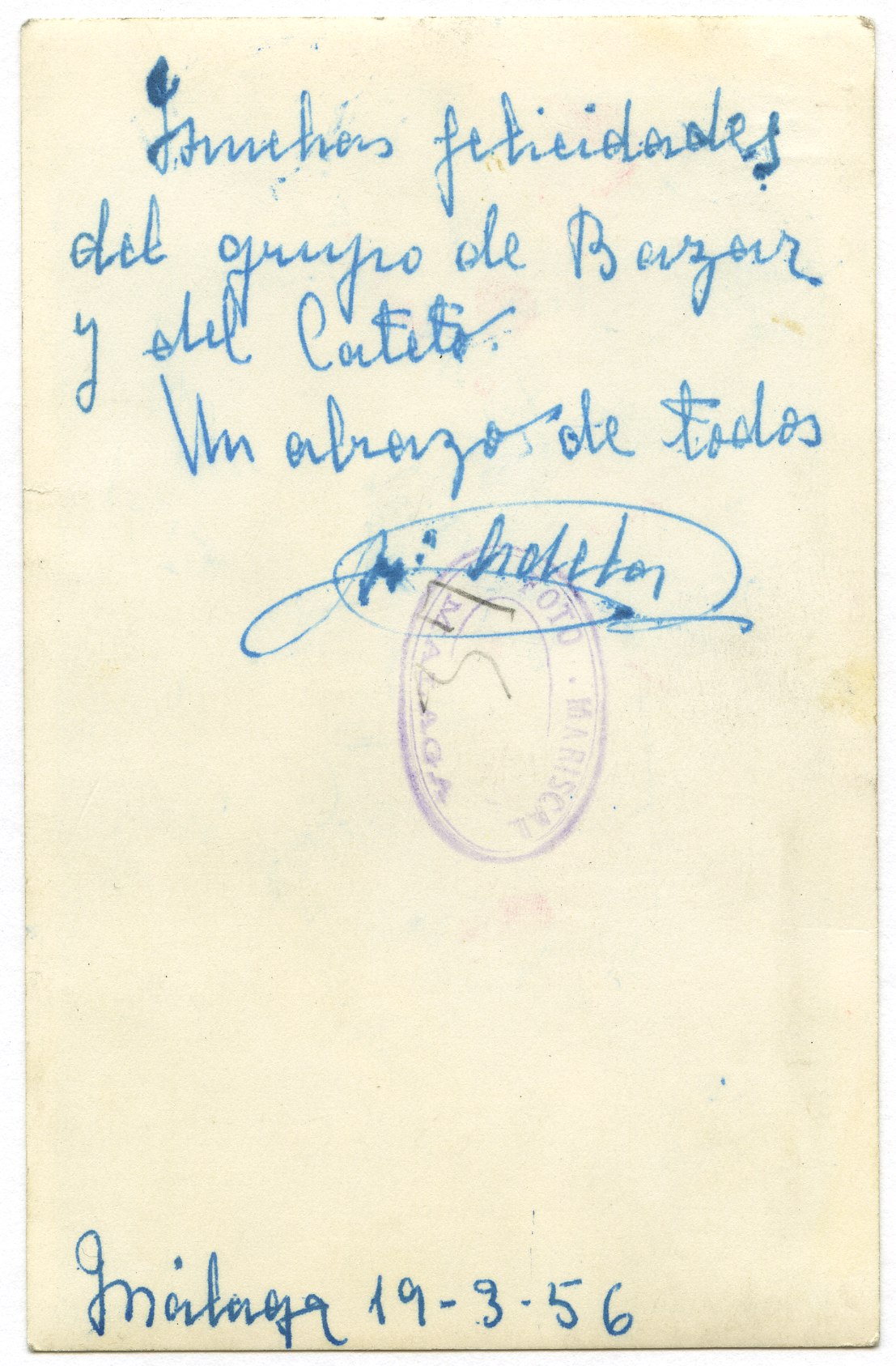 Fotografía tomada con los niños posando sentados en el suelo de un escenario.. Una anotación firmada y rubricada en el reverso de la imagen hace referencia al Grupo del Bazar y del Cateto, de Málaga.