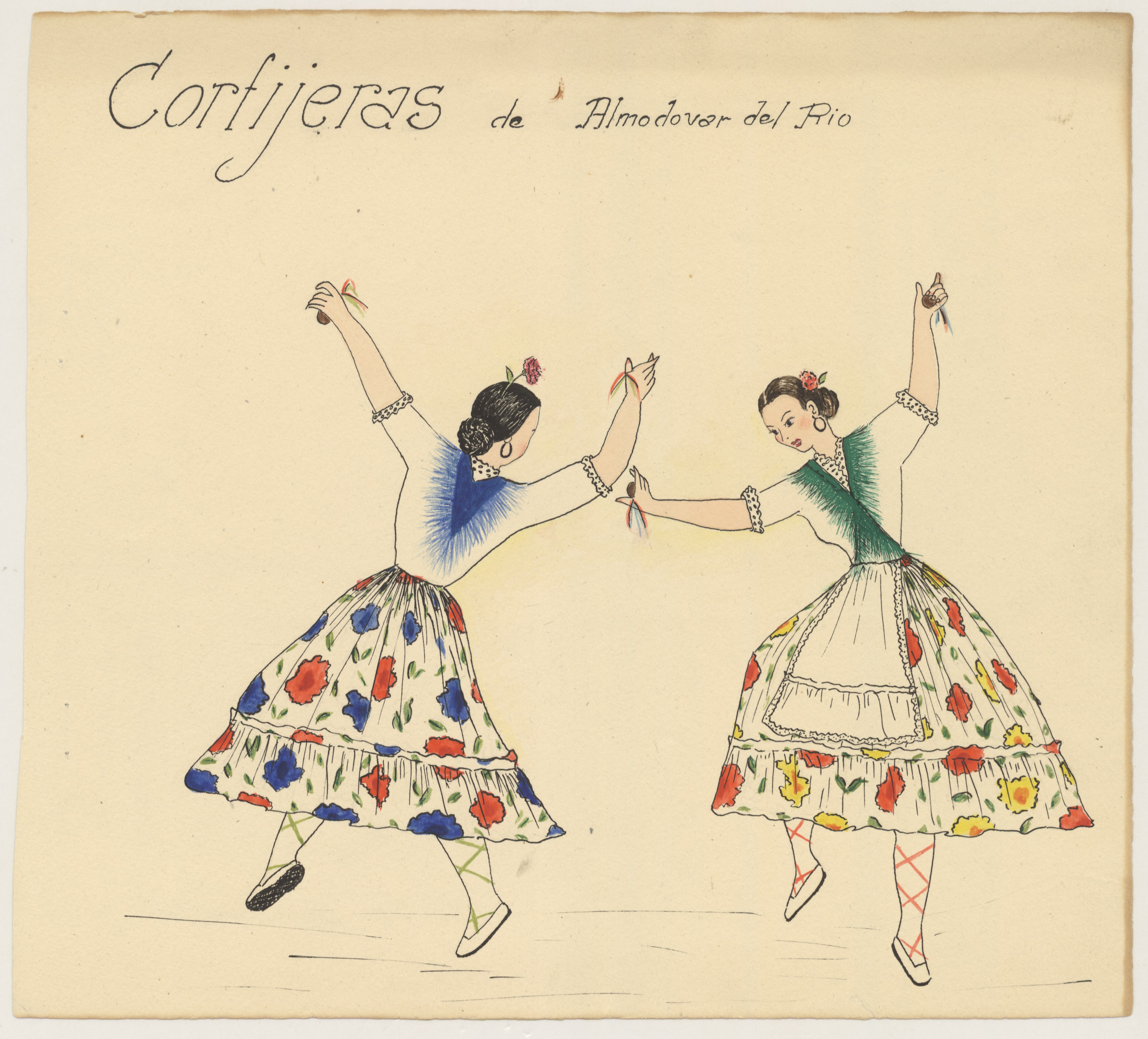 Dibujo de dos mujeres bailando vestidas con el traje típico cortijero de Almodóvar del Río.