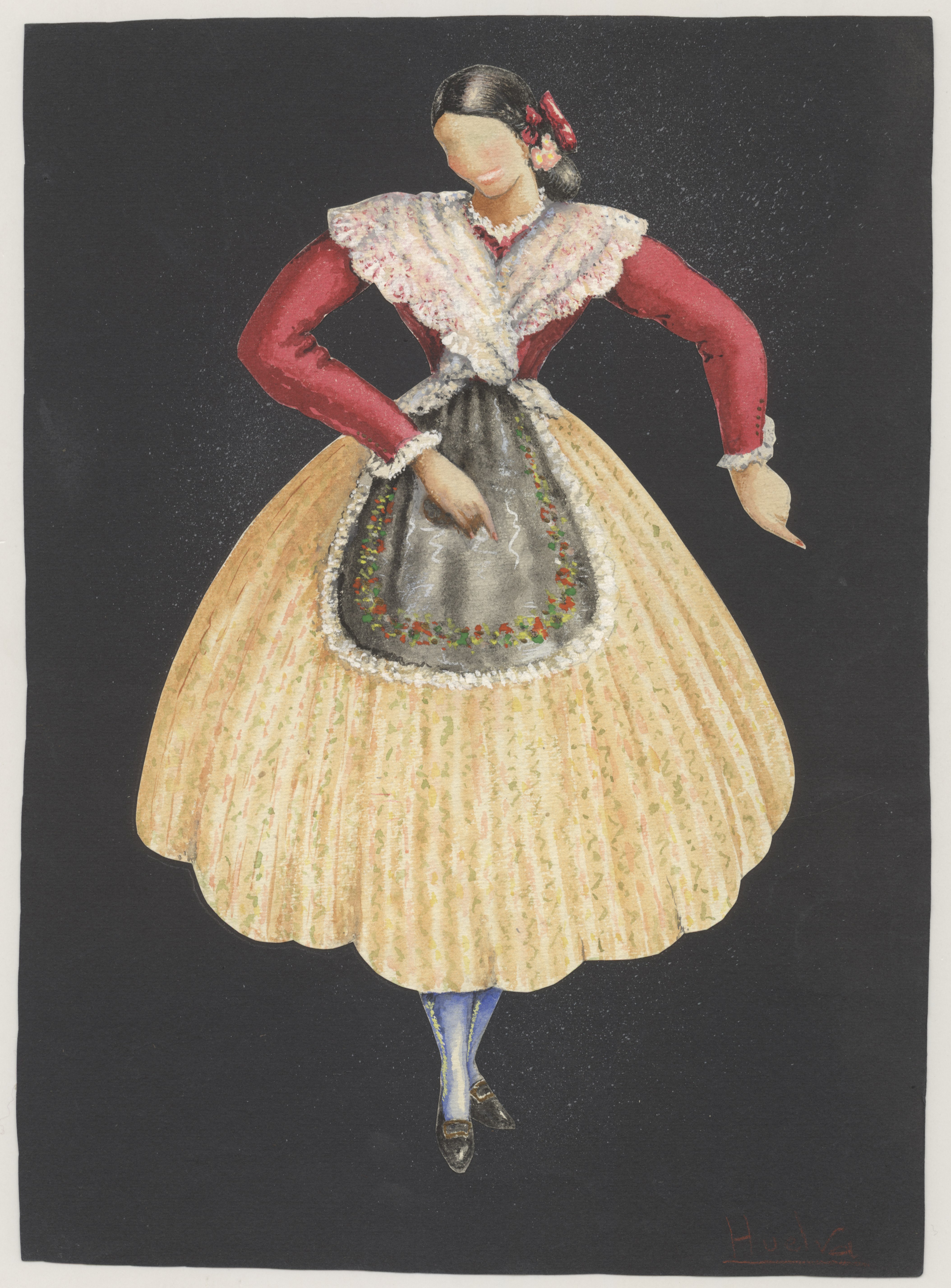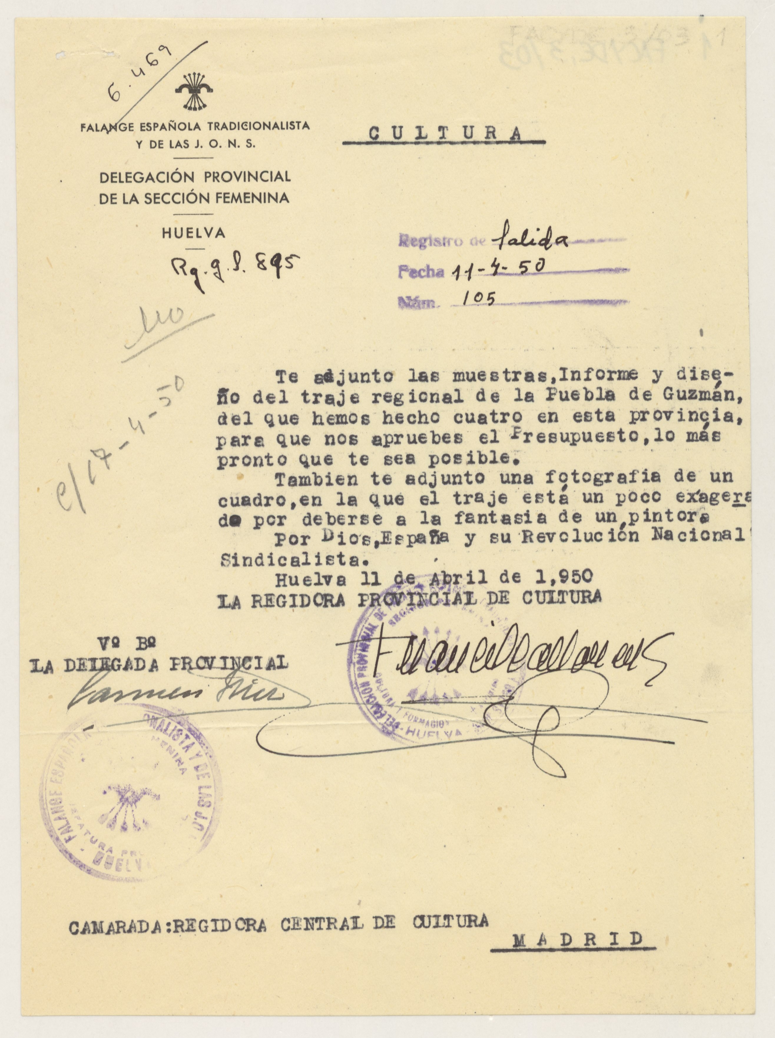 Carta de la Regidora Provincial de Cultura y de la Delegada Provincial de la Sección Femenina en Huelva a la Regidora Central de Cultura sobre el traje típico de Puebla de Guzmán.