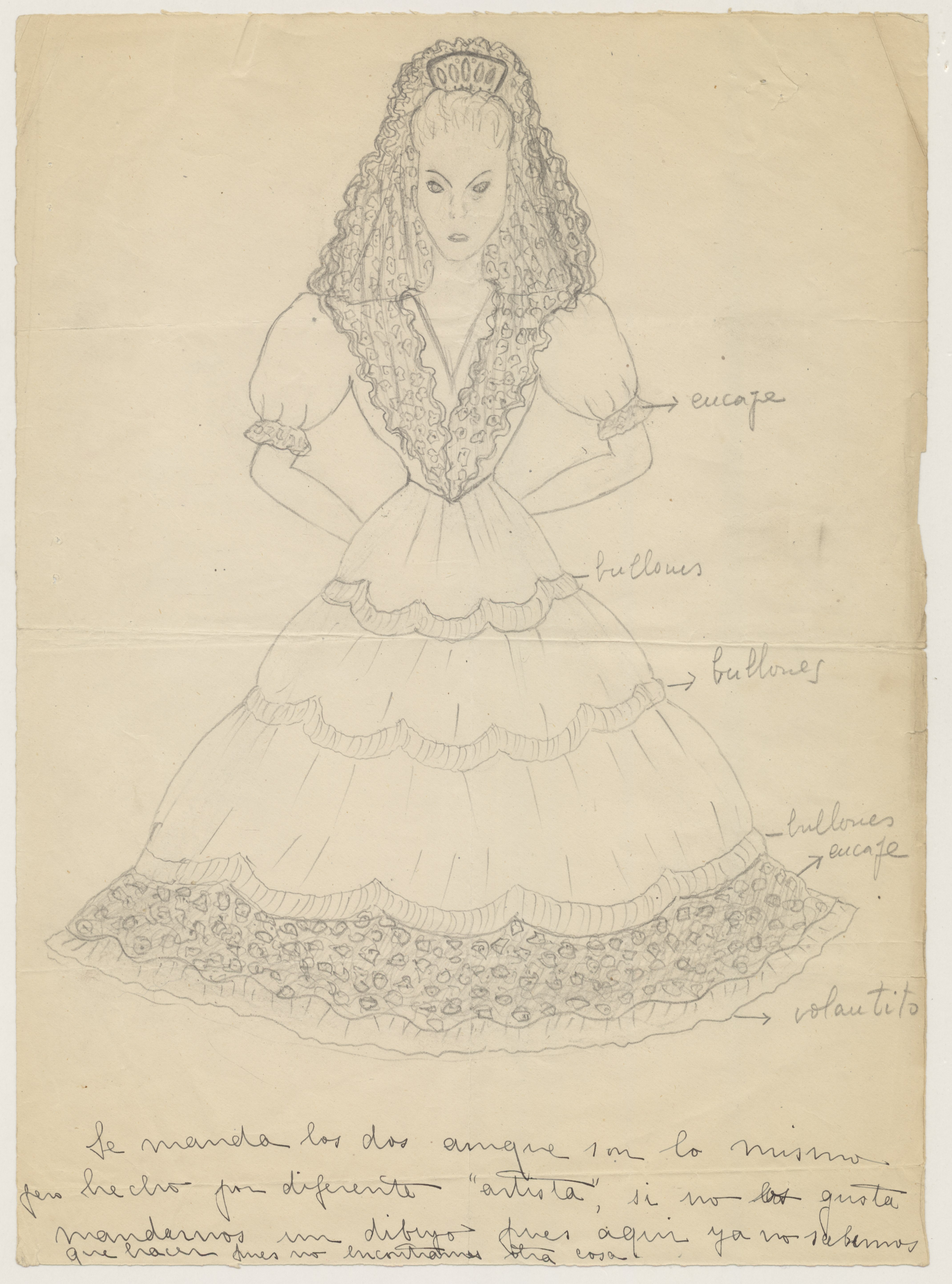 Dibujo de mujer vestida con traje típico de Sevilla.