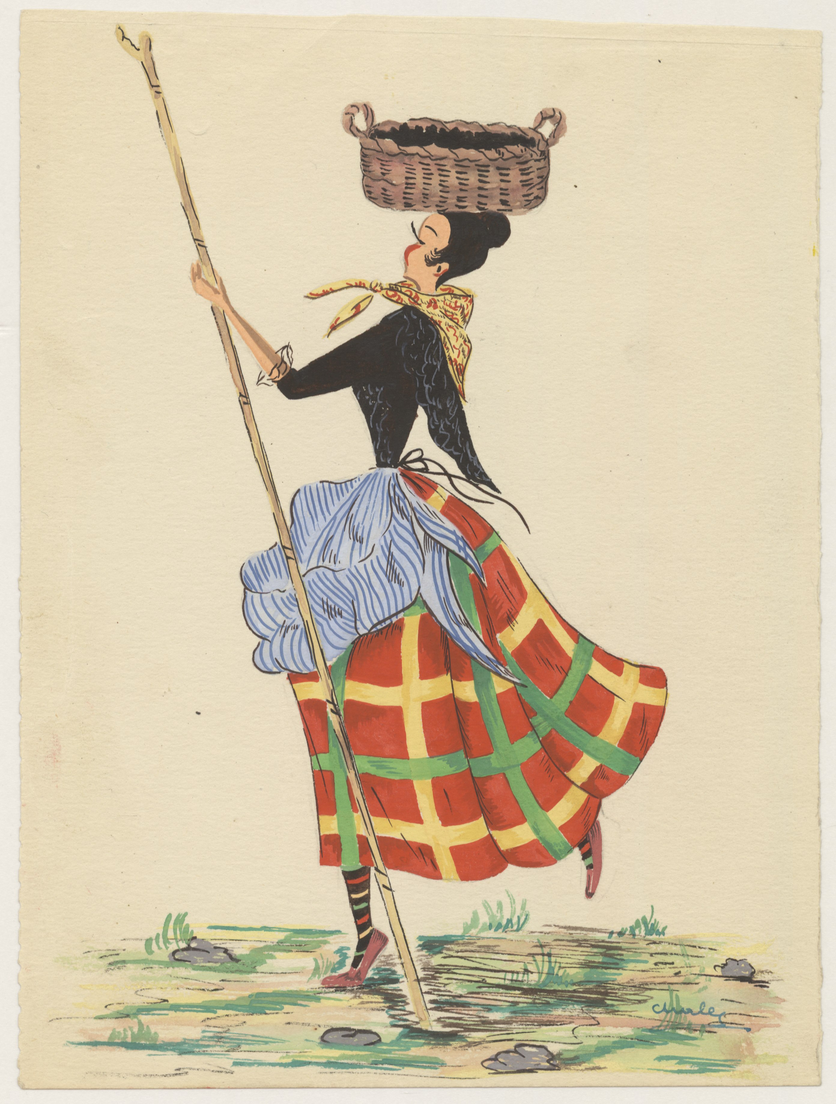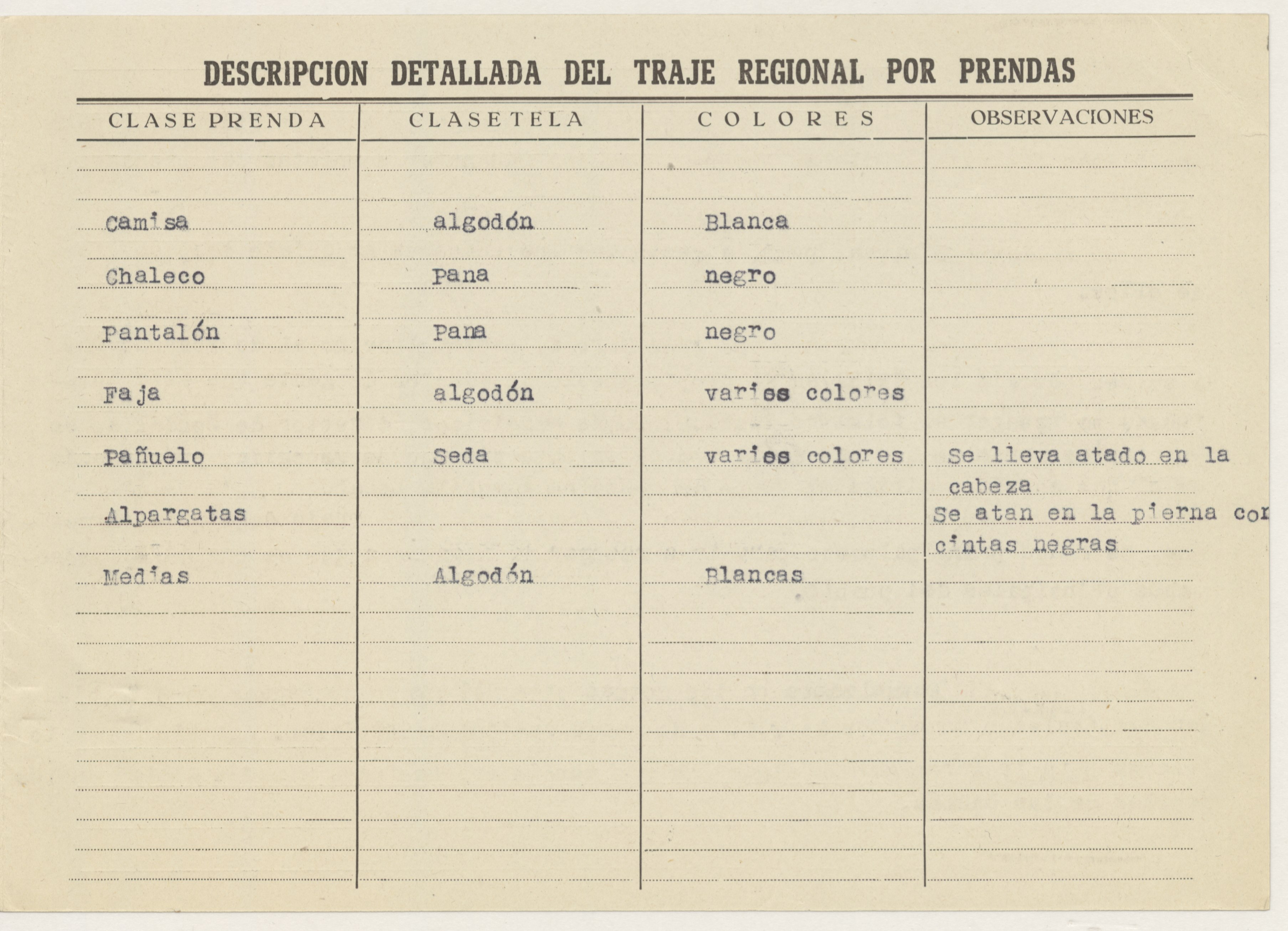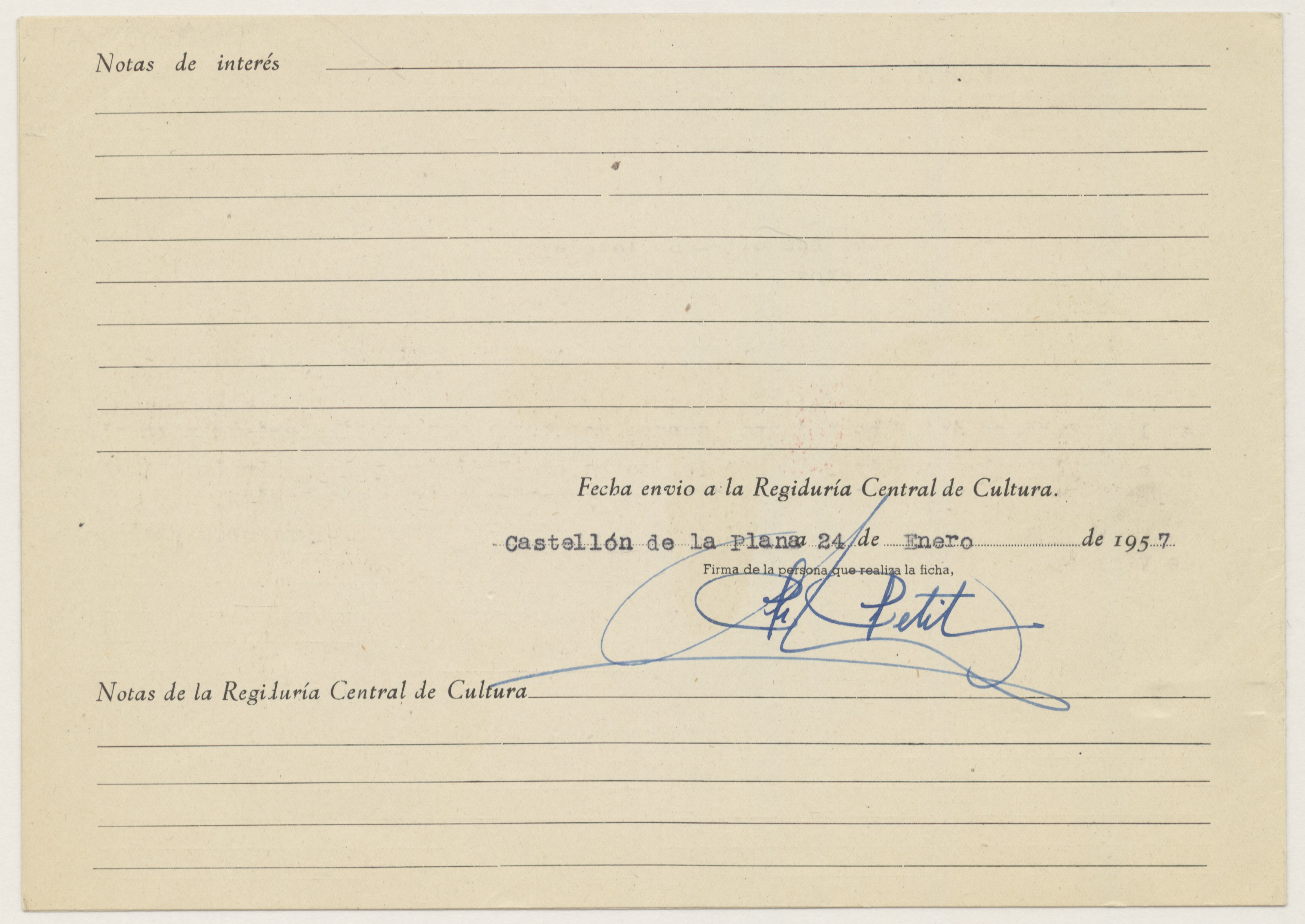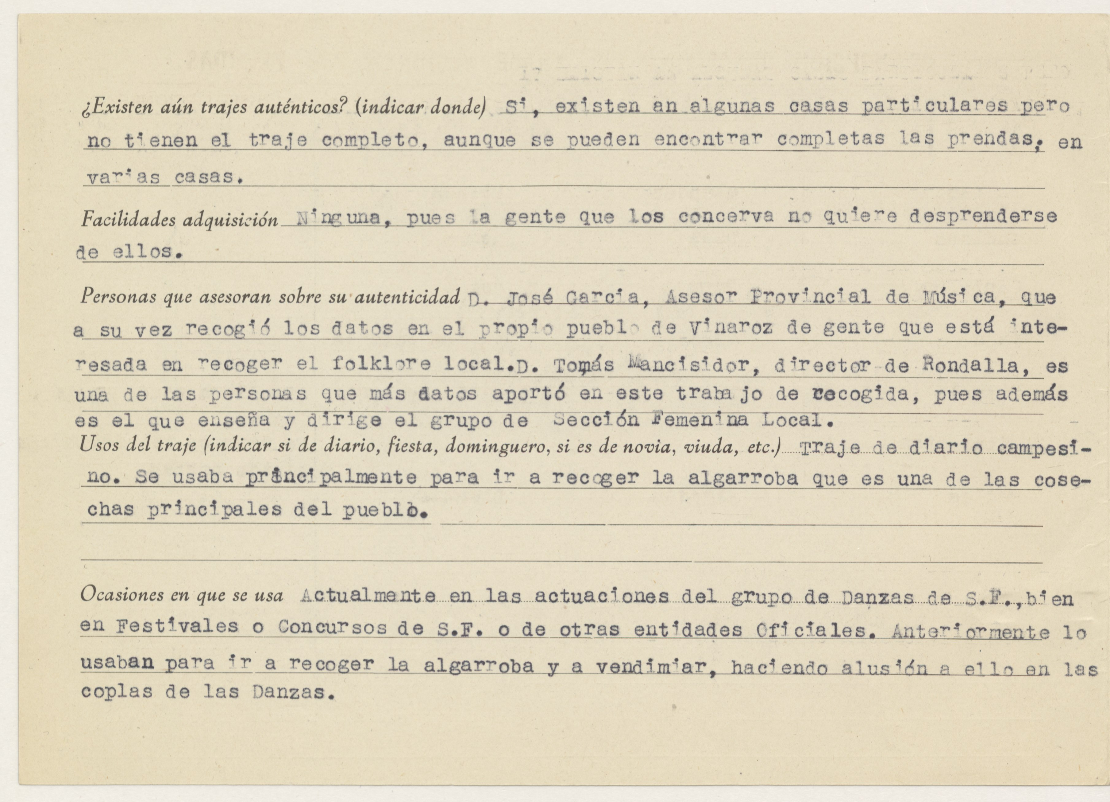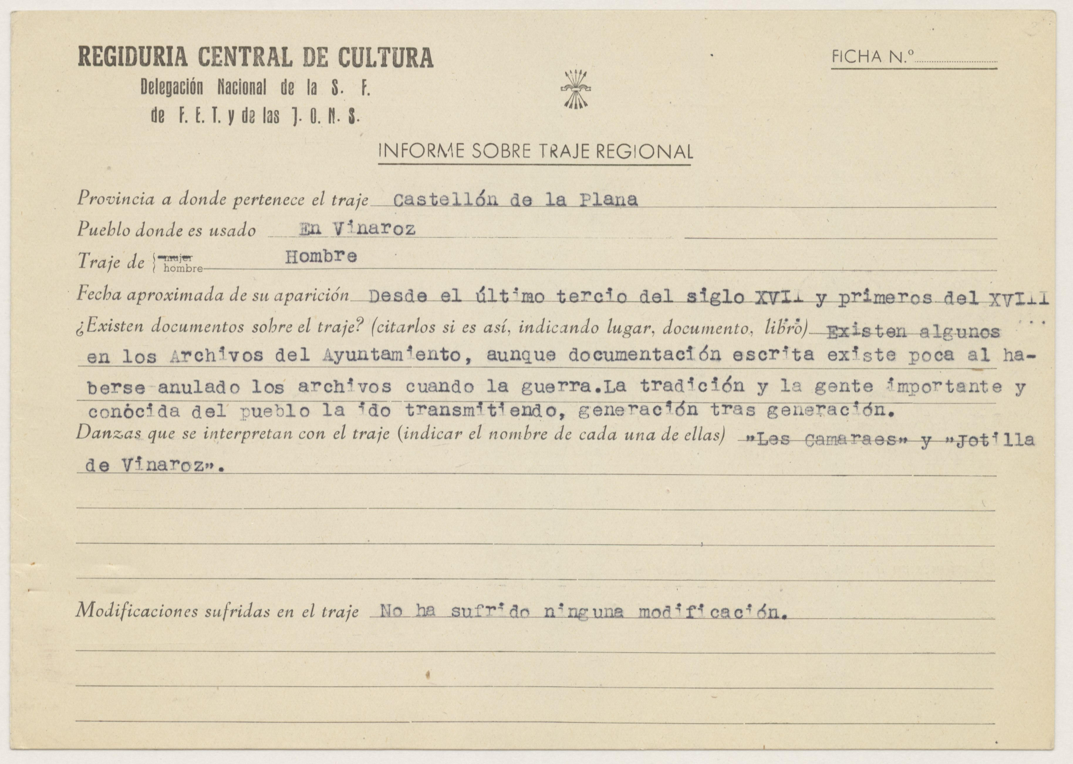 Contiene: carta en papel tamaño cuartilla con membrete de Falange Española Tradicionalista y de las JONS, Delegación Provincial de la Sección Femenina en Castellón. Esta carta lleva un sello de Registro de Salida número 336, las rúbricas de la Delegada Provincial, Josefa Sancho (Josefa Francisca Sancho Pérez), y de la Regidora Provincial de Cultura, P. Petit, así como los sellos de sus departamentos respectivos. Contiene también, una ficha informativa en cartulina tamaño cuartilla, doble, sobre el traje regional de hombre utilizado en Vinaroz, realizada, firmada y rubricada por P. Petit. Contiene, además, dos dibujos a color sobre papel grueso, uno del traje regional de hombre y otro, del de mujer, ambos firmados por el mismo ilustrador, Charles.