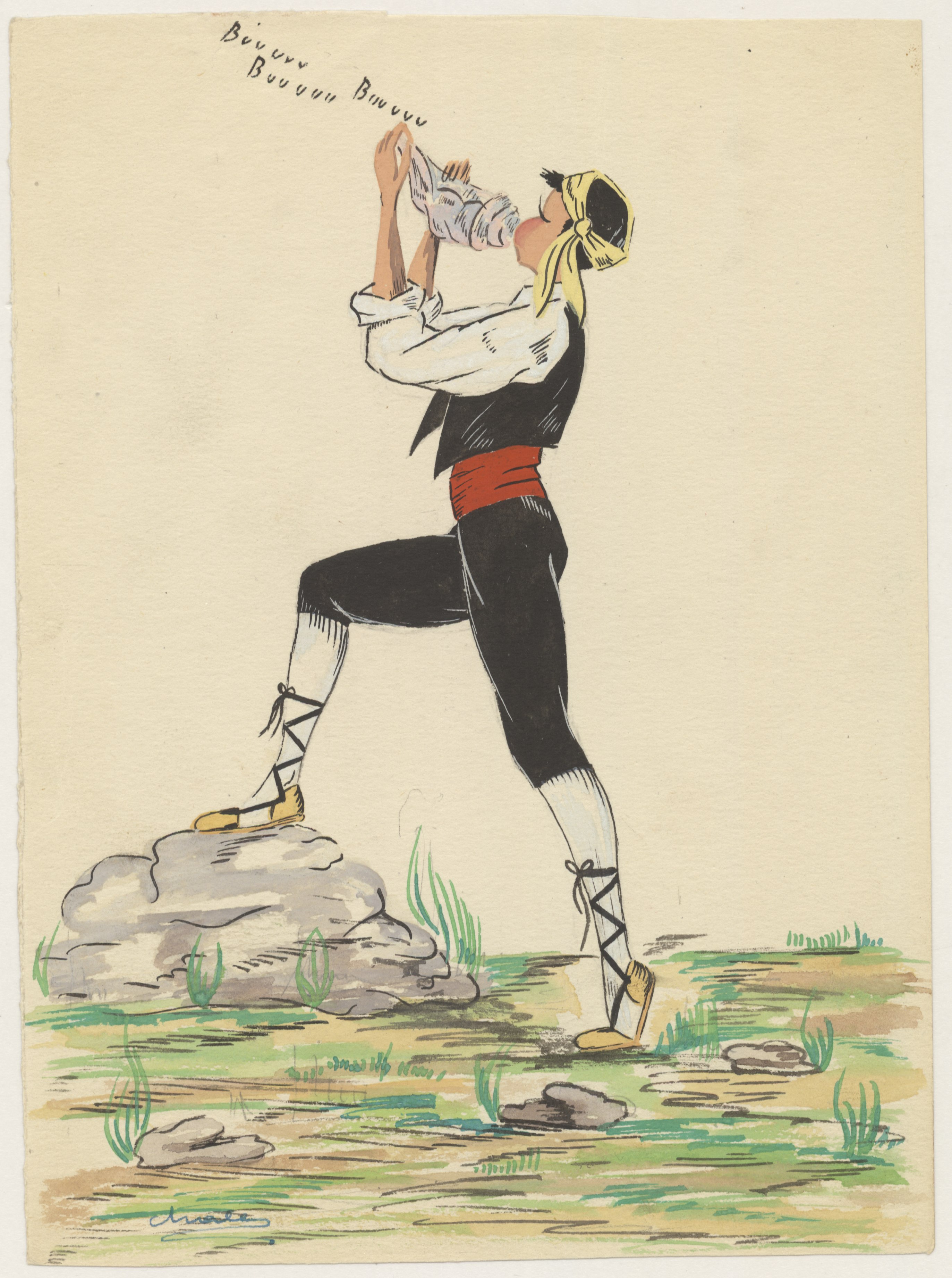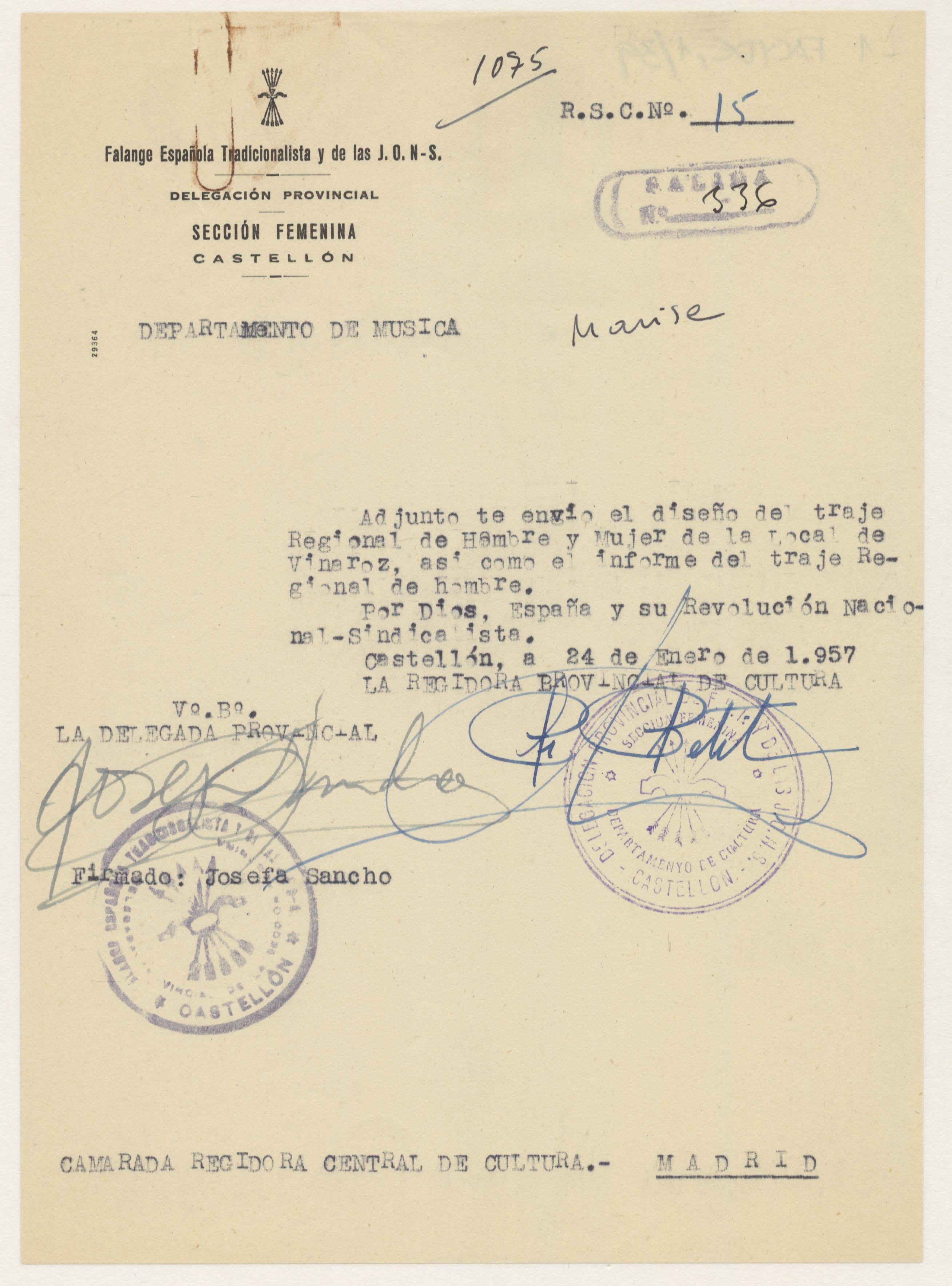 Contiene: carta en papel tamaño cuartilla con membrete de Falange Española Tradicionalista y de las JONS, Delegación Provincial de la Sección Femenina en Castellón. Esta carta lleva un sello de Registro de Salida número 336, las rúbricas de la Delegada Provincial, Josefa Sancho (Josefa Francisca Sancho Pérez), y de la Regidora Provincial de Cultura, P. Petit, así como los sellos de sus departamentos respectivos. Contiene también, una ficha informativa en cartulina tamaño cuartilla, doble, sobre el traje regional de hombre utilizado en Vinaroz, realizada, firmada y rubricada por P. Petit. Contiene, además, dos dibujos a color sobre papel grueso, uno del traje regional de hombre y otro, del de mujer, ambos firmados por el mismo ilustrador, Charles.