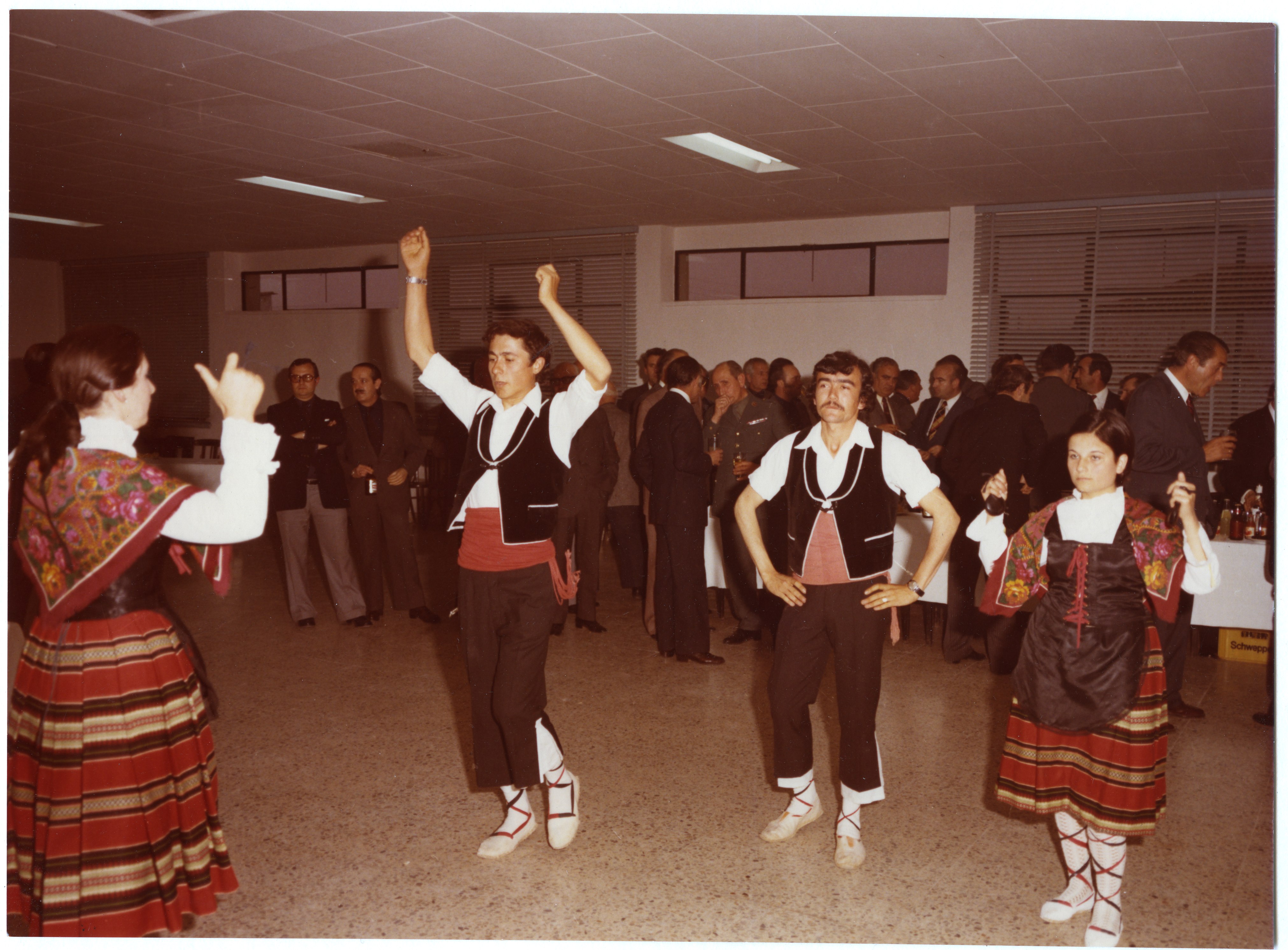 Fotografía del grupo vestidos con el traje típico regional tomada mientras bailan en un salón durante una celebración.