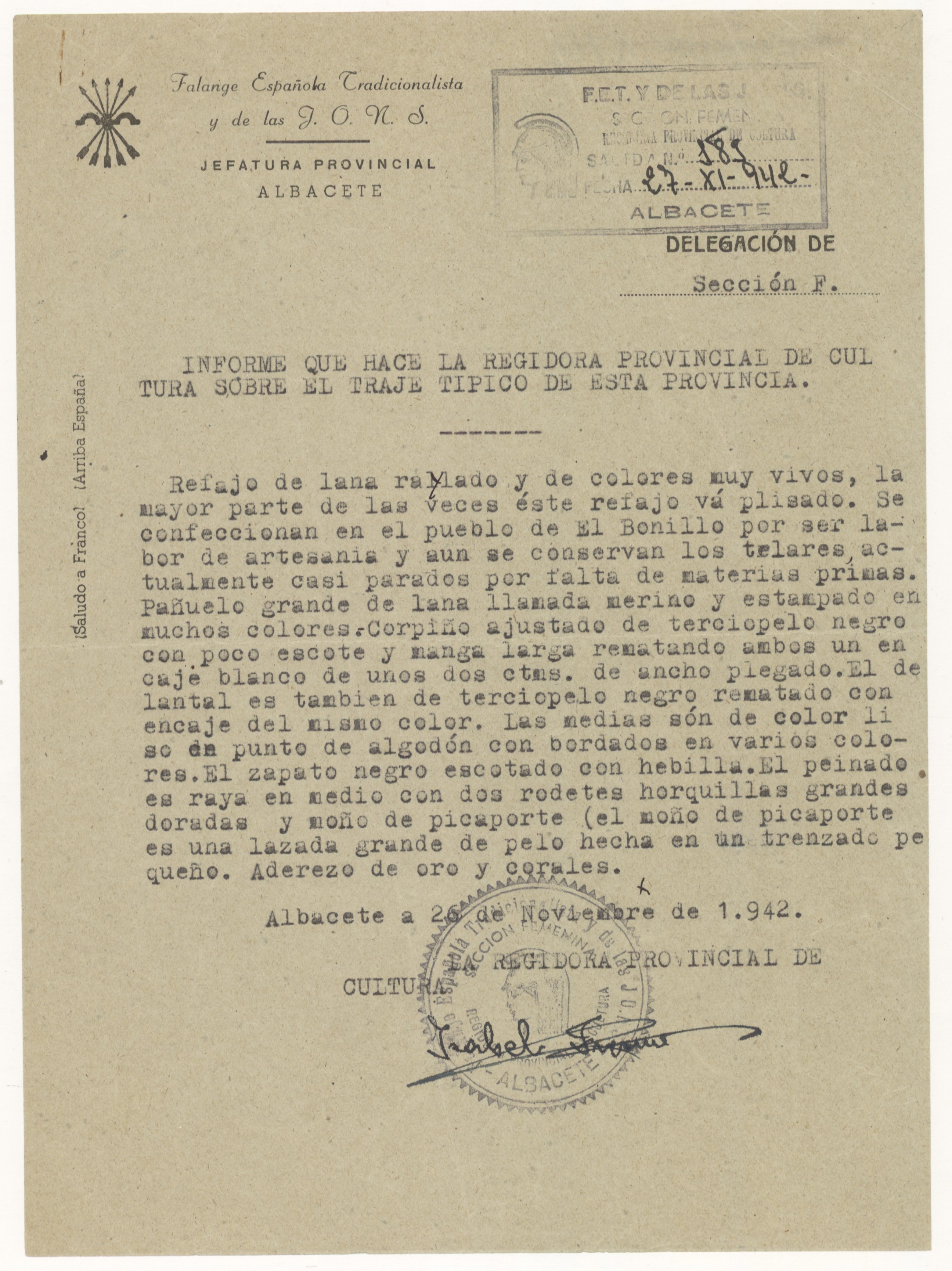 Informe sobre el traje típico de esta provincia que hace la Regidora Provincial de Cultura de la Delegación Provincial de la Sección Femenina de Falange Española Tradicionalista y de las JONS de Albacete.
