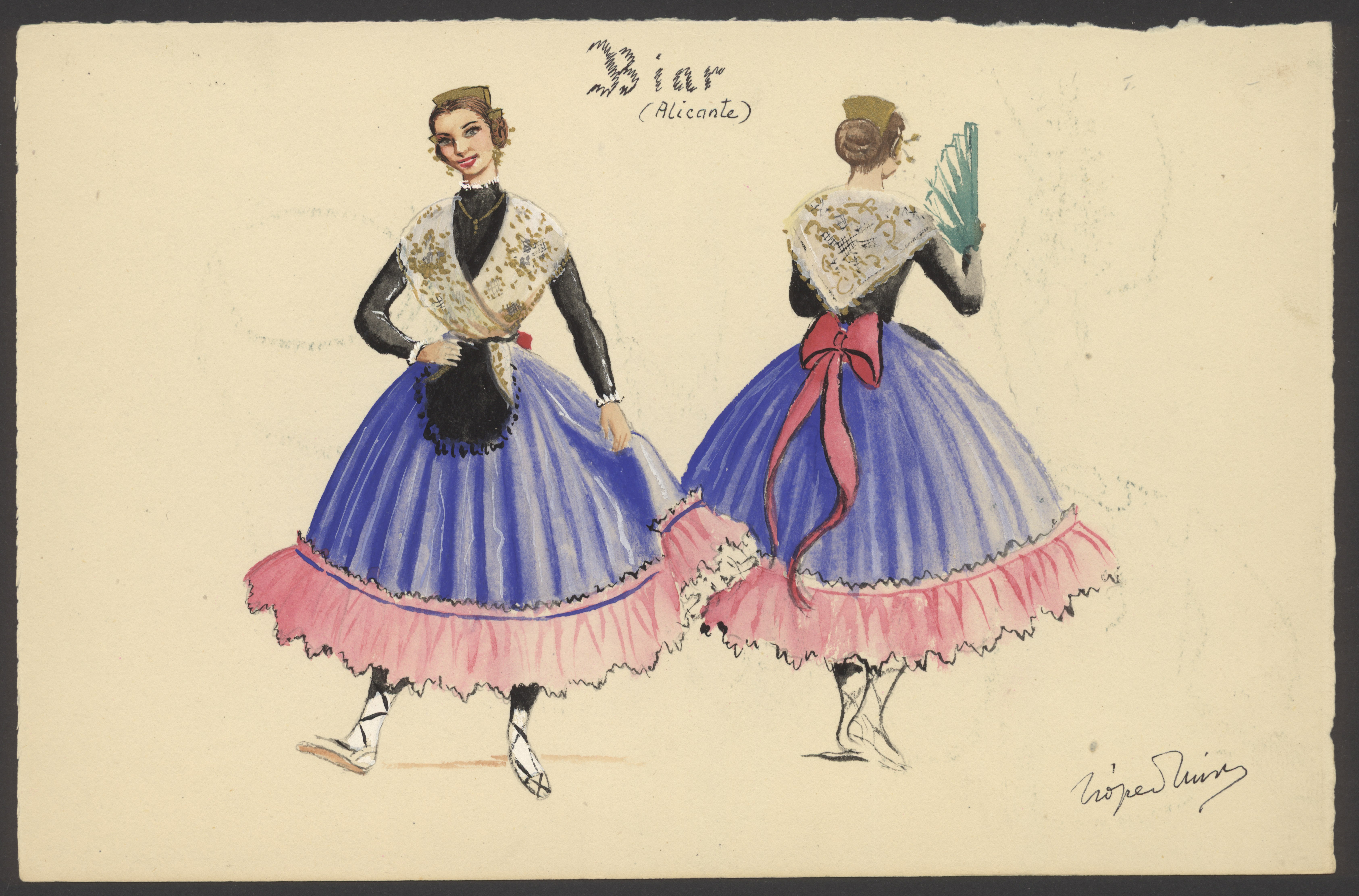Dibujos a color de los trajes típicos de mujer y de hombre de Biar.