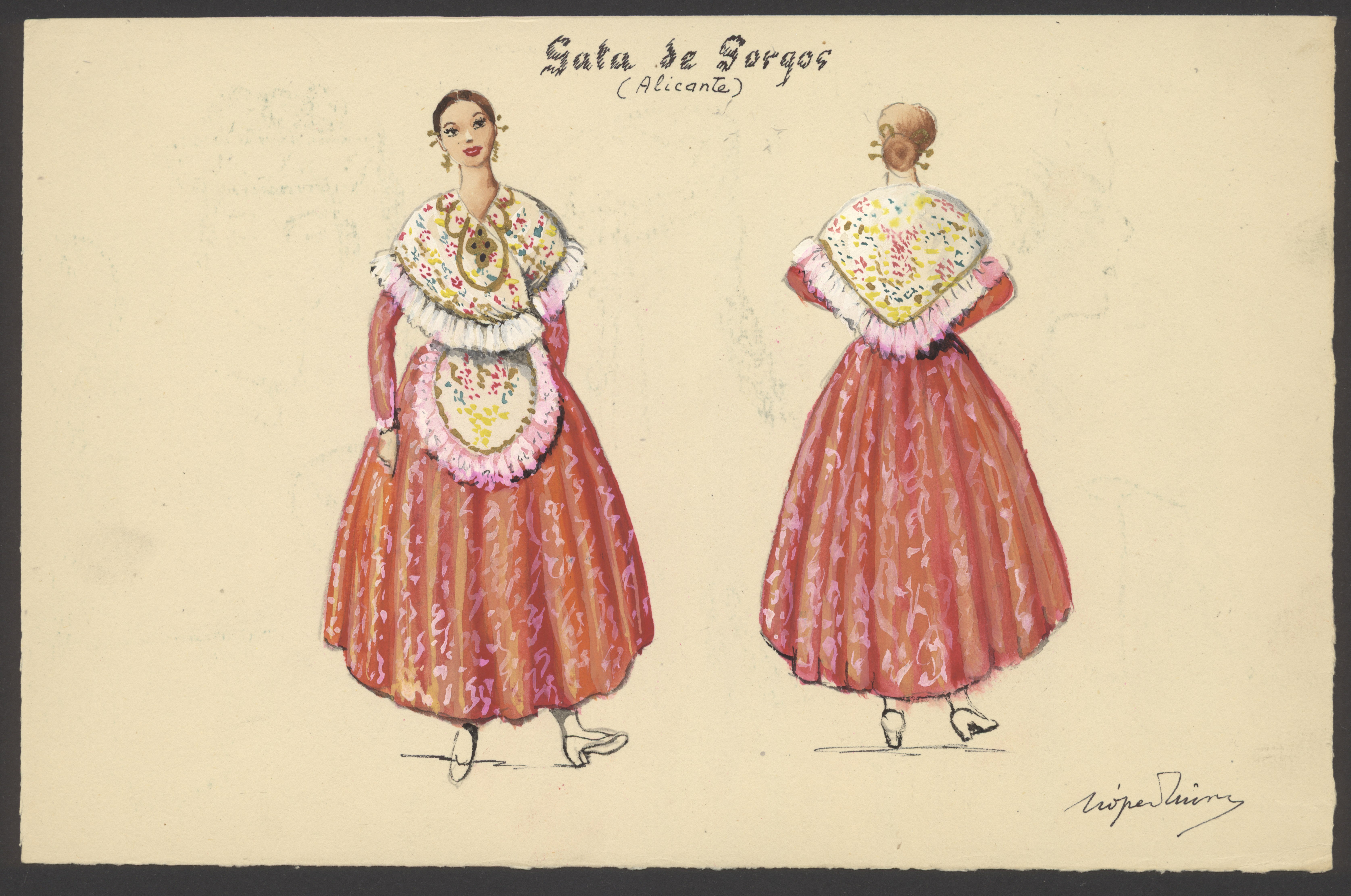 Dibujo a color del traje típico de mujer de Gata de Gorgos.