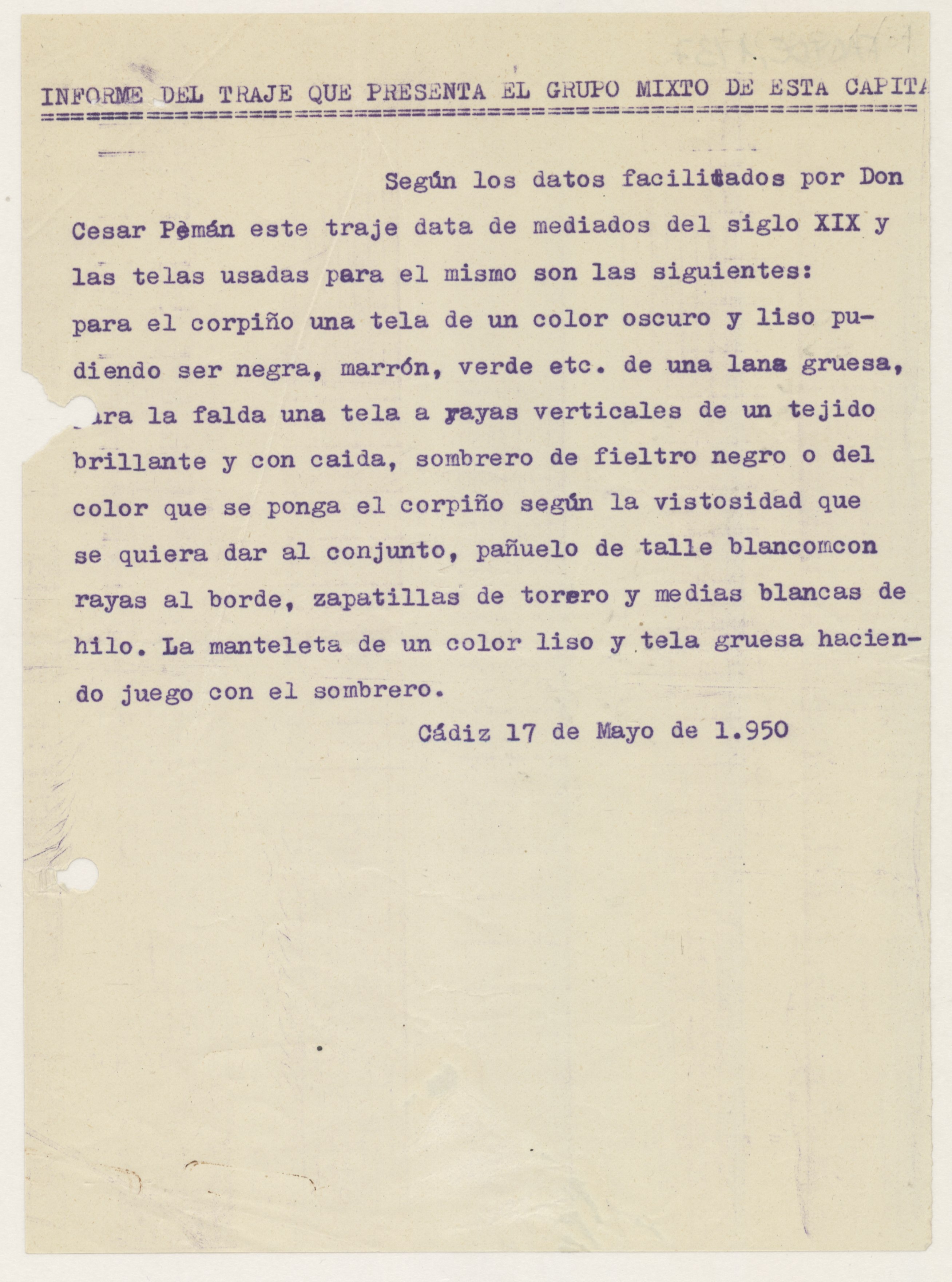 Informe sobre el traje típico de Cádiz presentado por el Grupo Mixto de la ciudad.