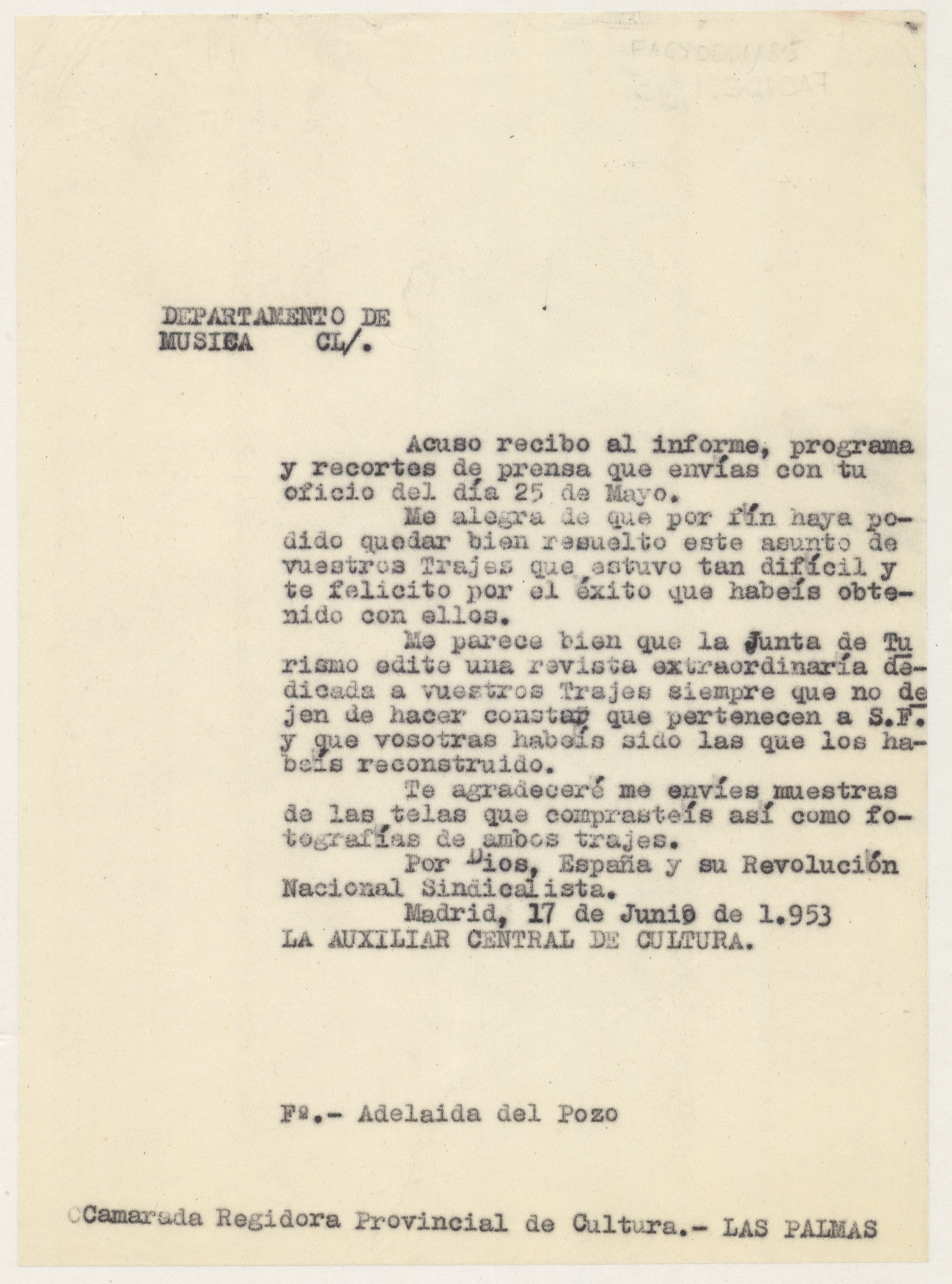 Copia de la carta de Adelaida del Pozo, auxiliar central de Cultura, acusando recibo de otra anterior enviada por Ana Teresa Fernández, regidora provincial de Cultura.