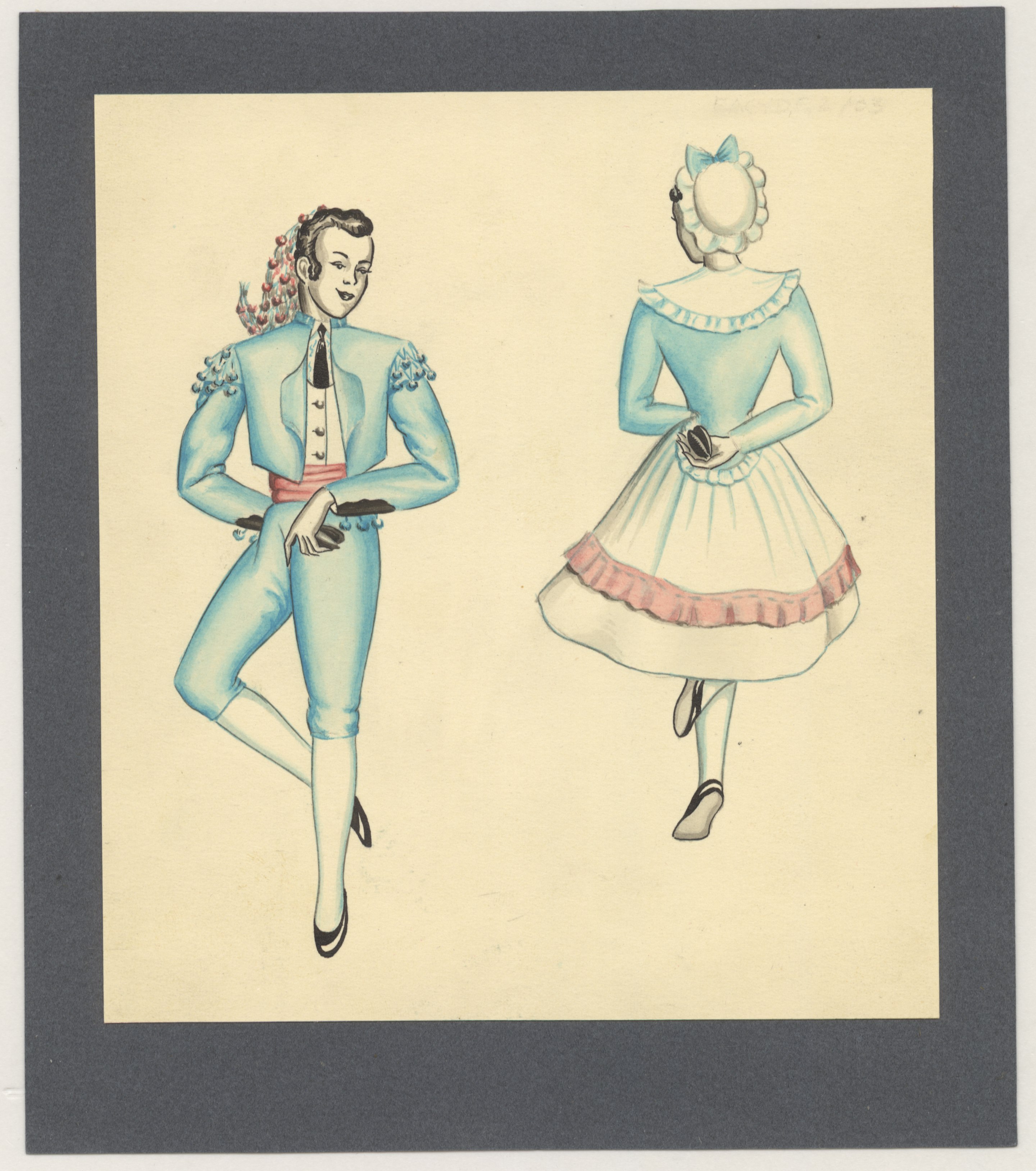 Dibujos de una pareja bailando, vestida con los trajes típicos regionales.