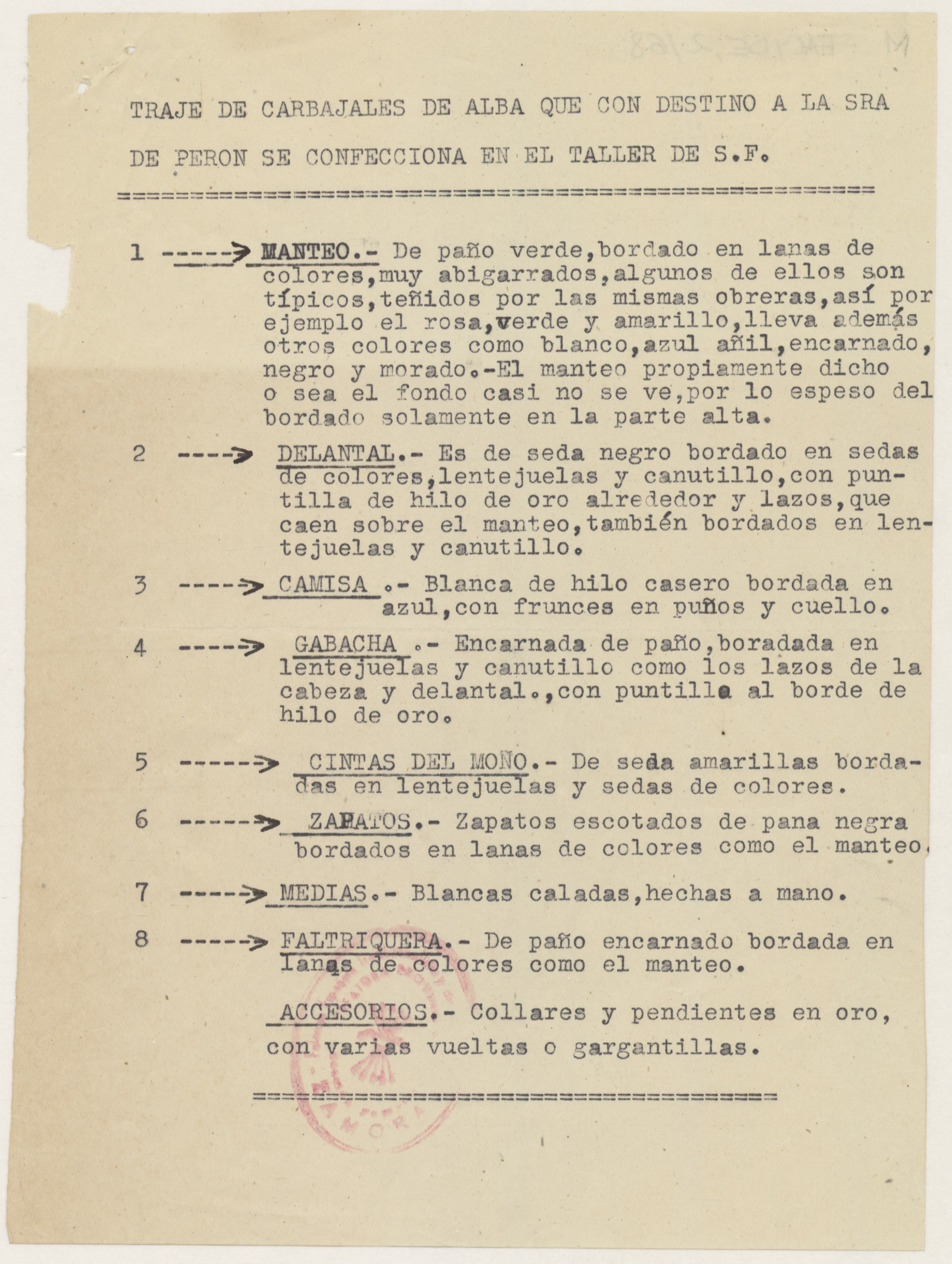 Informe sobre el traje típico regional de Carbajales de Alba que, con destino a la señora Eva Perón, se confecciona en el taller de la Sección Femenina.